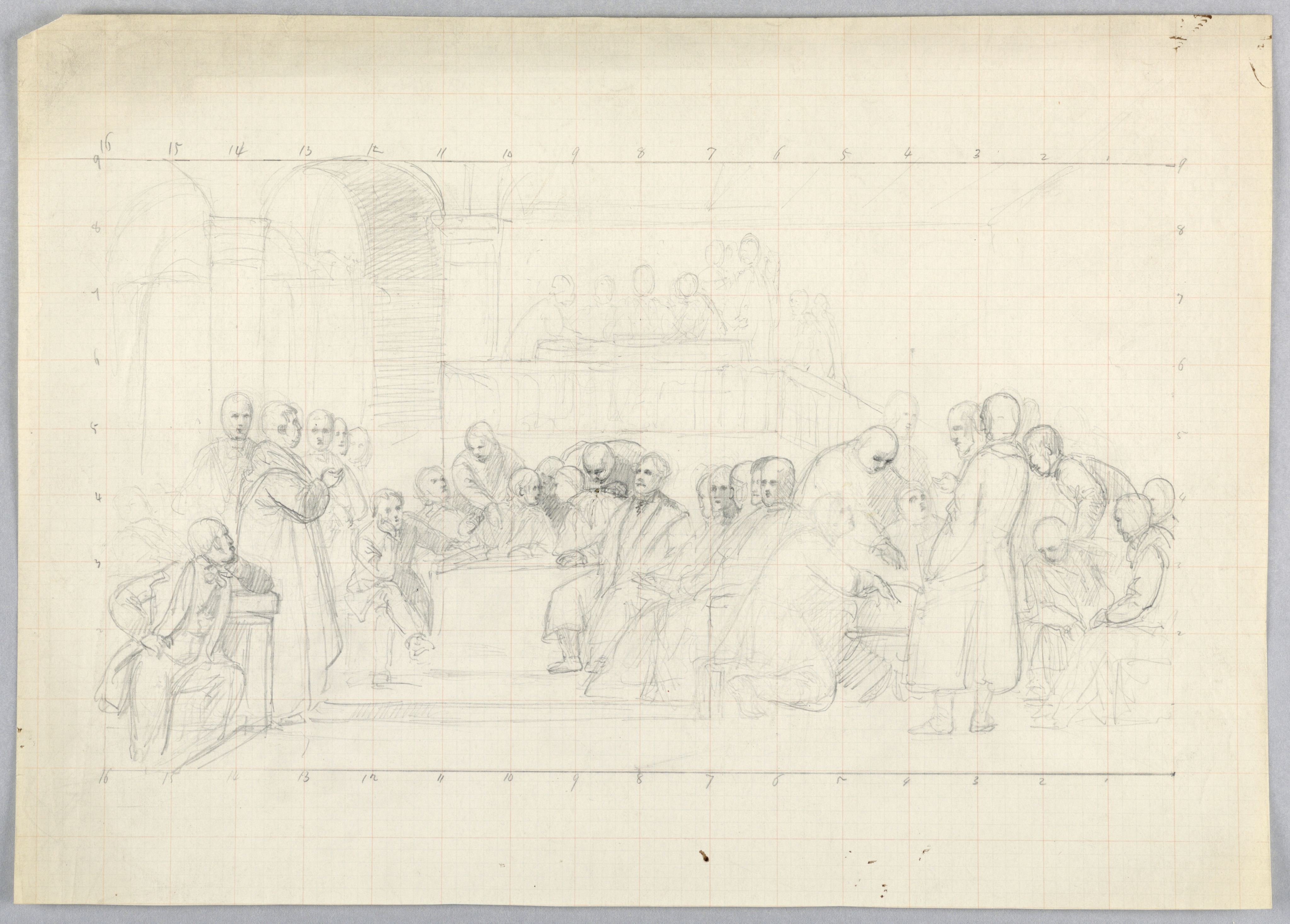 Drawing, Study for "Scientific Group"; Daniel Huntington (American, 1816–1906); USA; graphite on squared cream wove paper; 28.9 x 40.5 cm (11 3/8 x 15 15/16 in.); Bequest of Erskine Hewitt; 1942-50-263