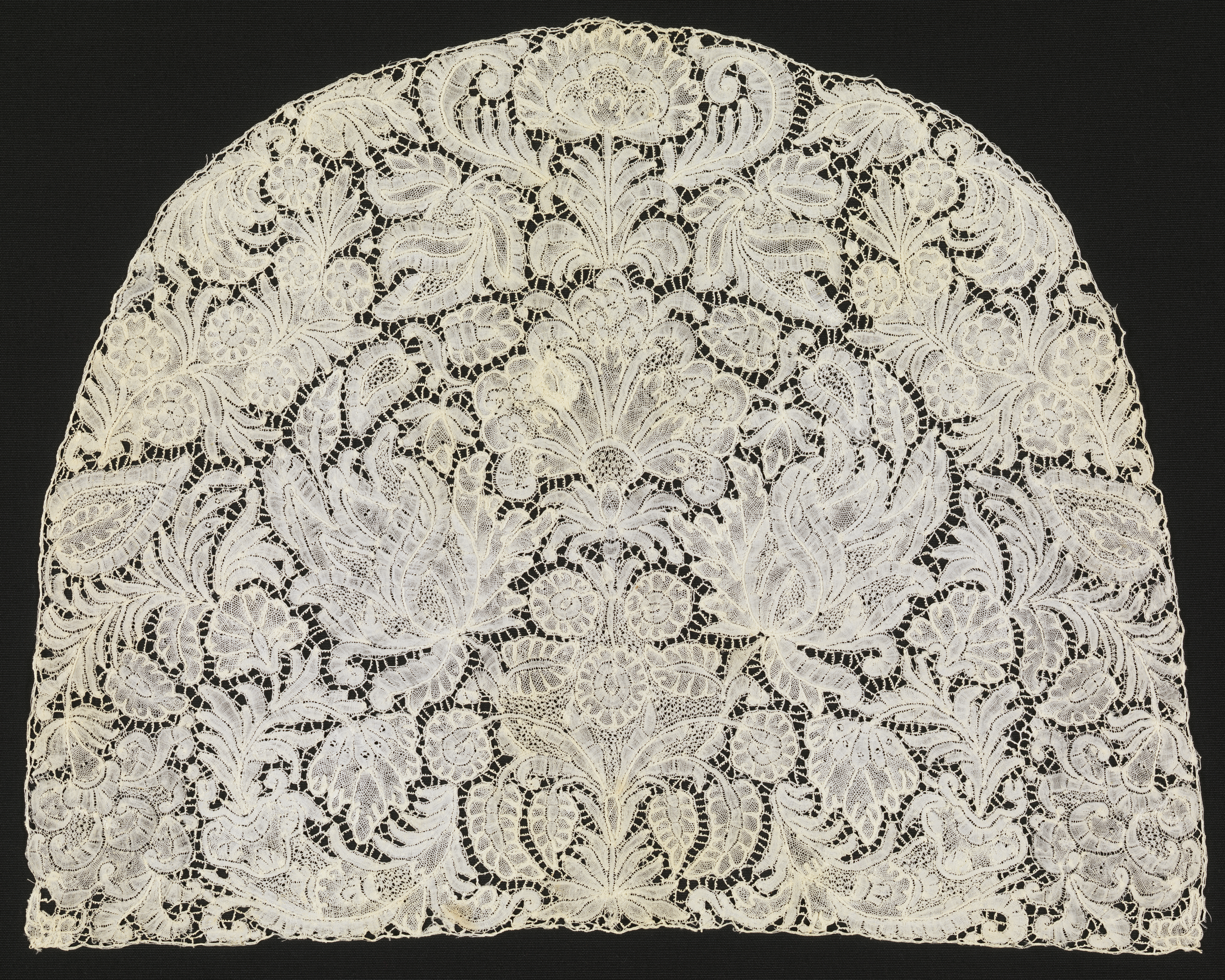 This is a Cap crown. It is dated 1700–1750 and we acquired it in 1943. Its medium is linen and its technique is bobbin lace, brussels style. It is a part of the Textiles department.