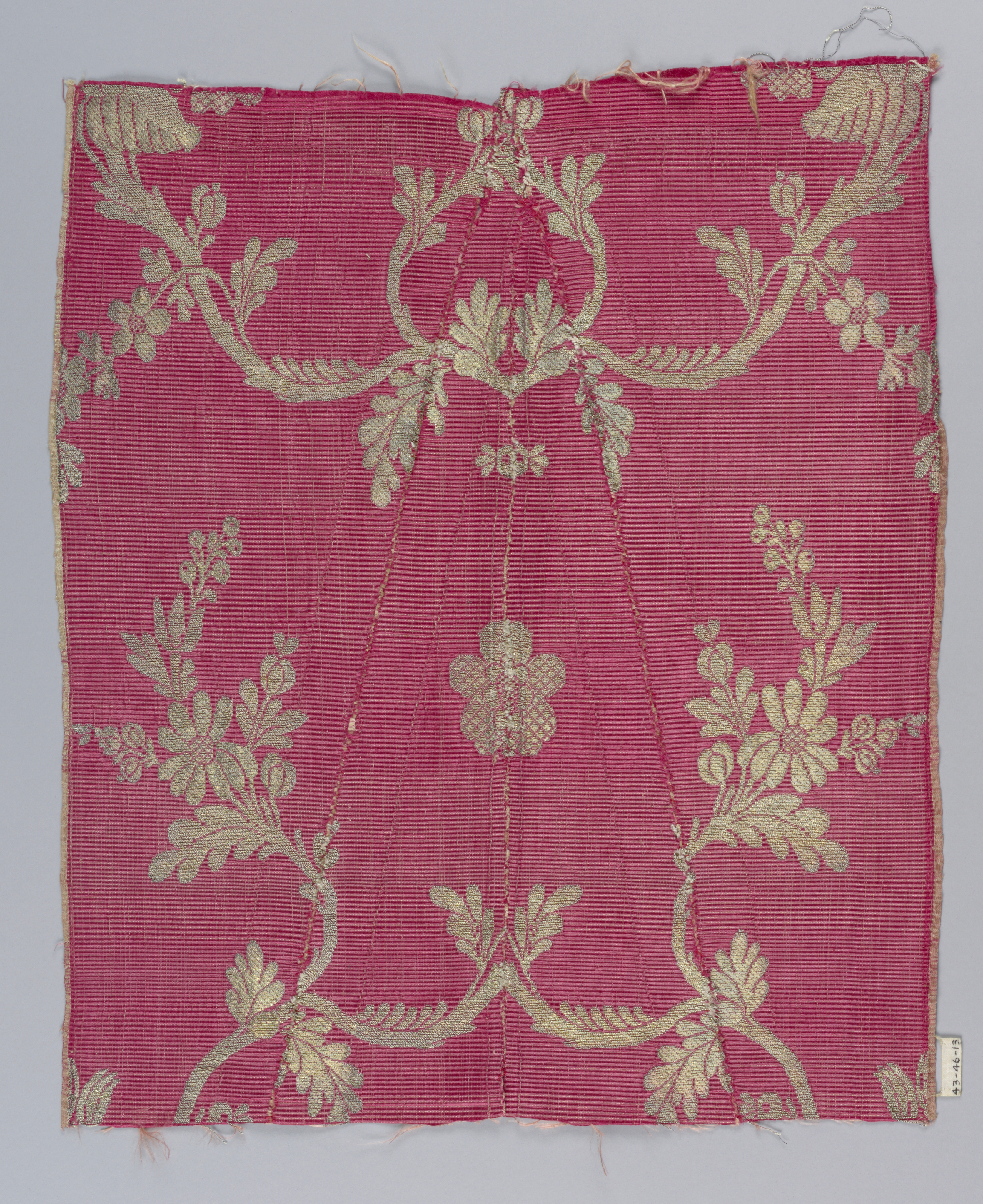 This is a Textile. It is dated 18th century and we acquired it in 1943. Its medium is silk and metallic thread and its technique is plain compound cloth, brocaded. It is a part of the Textiles department.