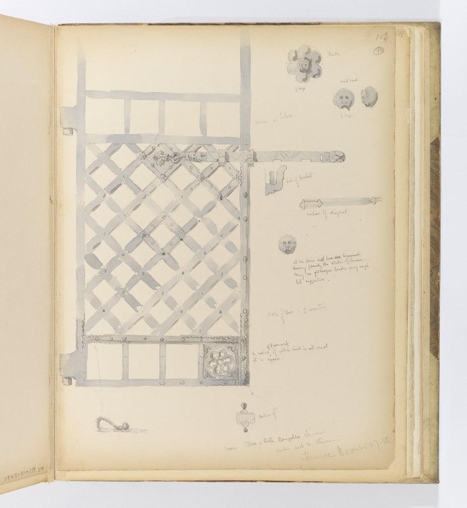 Recto, in graphite, upper right corner: (inscribed in circle) 90 / 103; at bottom right: Iron Door or Gate - Bargello staircase / under arch in staircase / Florence November 17 -88. Inscriptions for the marginalia beginning at top right: rosette / 1/2 size; nail head / 1/2 size; same as below; side of bracket; section of diagonal; all the plain nail heads are hammered / showing plainly the strokes of hammer / Many are grotesque heads very rough / but suggestive -; scale of door = 1/16 execution; the section of ironwork of gothic circle is not round/ it is square; section of [arrow pointing to bottom of door].