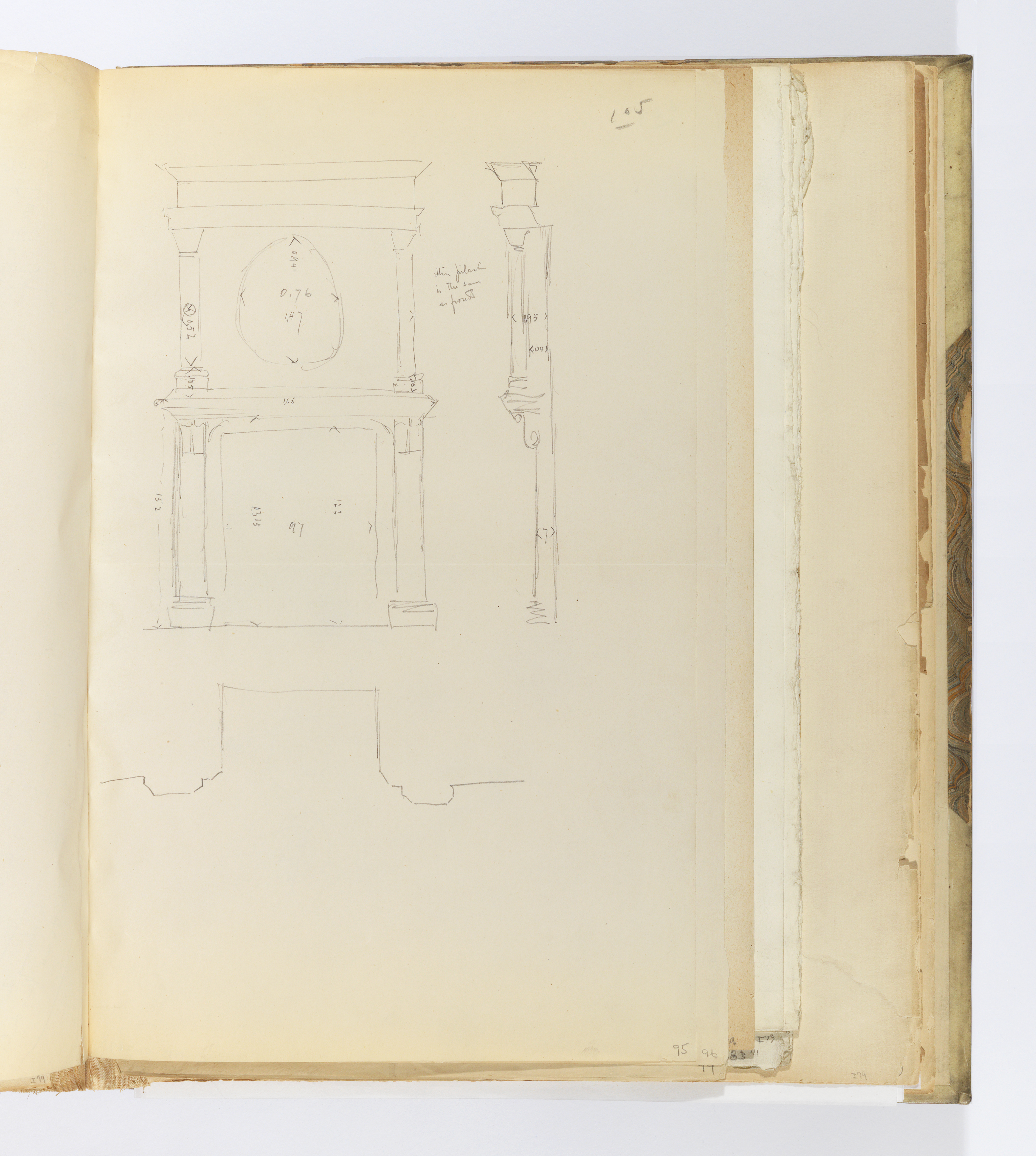 Recto, in graphite, lower left: modillion; to right: this modillion rests on top of pilaster / gold ... cut out of wood to depth of about .001. . . / bottom center edge of sheet: Base of / Pilaster. Verso, in graphite, center: Chimney at Blois Chateau; upper right corner: 104.