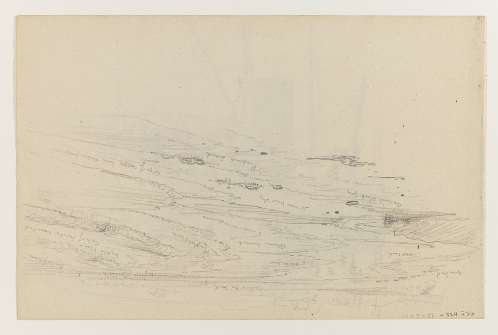 Recto, in graphite: bottom left corner: Newport / Aug / 85. Verso, in graphite at upper left corner of sheet (written upside down and parallel to drawing): 1943-51-324 / I79; inscribed in drawing clockwise from bottom left: grayish black gray / wet sand / gray sand / yellow gray sand / light whitish / lightish blue / back of breaks warm dark / purplish black / blue grayish / edge of ripples have darker purplish.