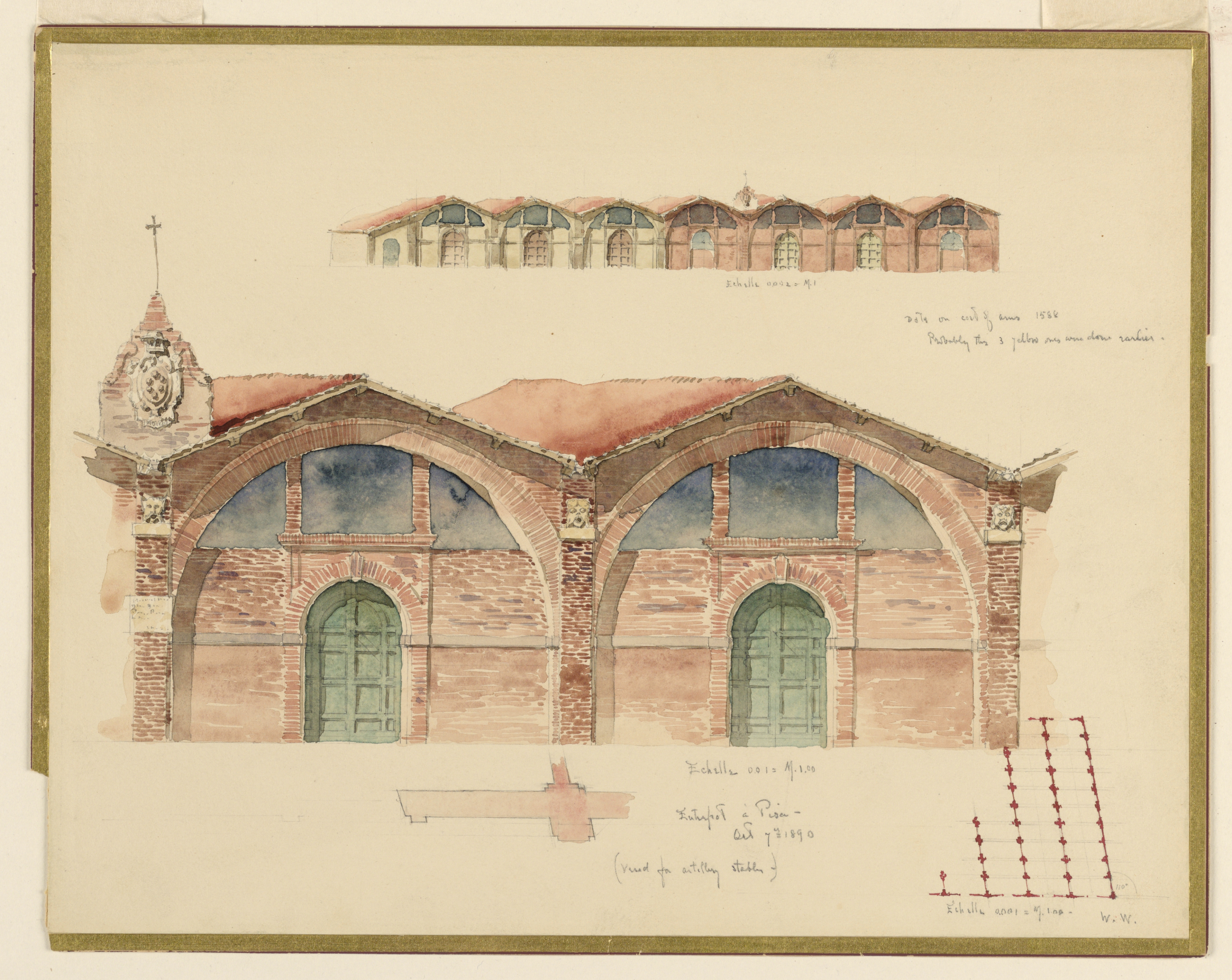 Inscribed in graphite, above: Echelle 0.002 = M. 1 / Date on coat of arms, 1588 / Probably the 3 yellow ones were done earlier. Lower: Entrepot à Pisa / October 7th 1890 / (Used for artillery stables)
