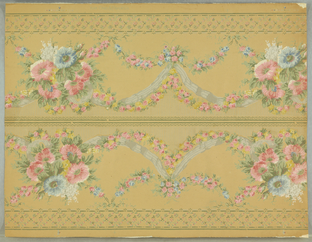 This is a frieze. It was manufactured by York Wall Paper Company. It is dated 1890–1900 and we acquired it in 1944. Its medium is machine-printed. It is a part of the Wallcoverings department.
