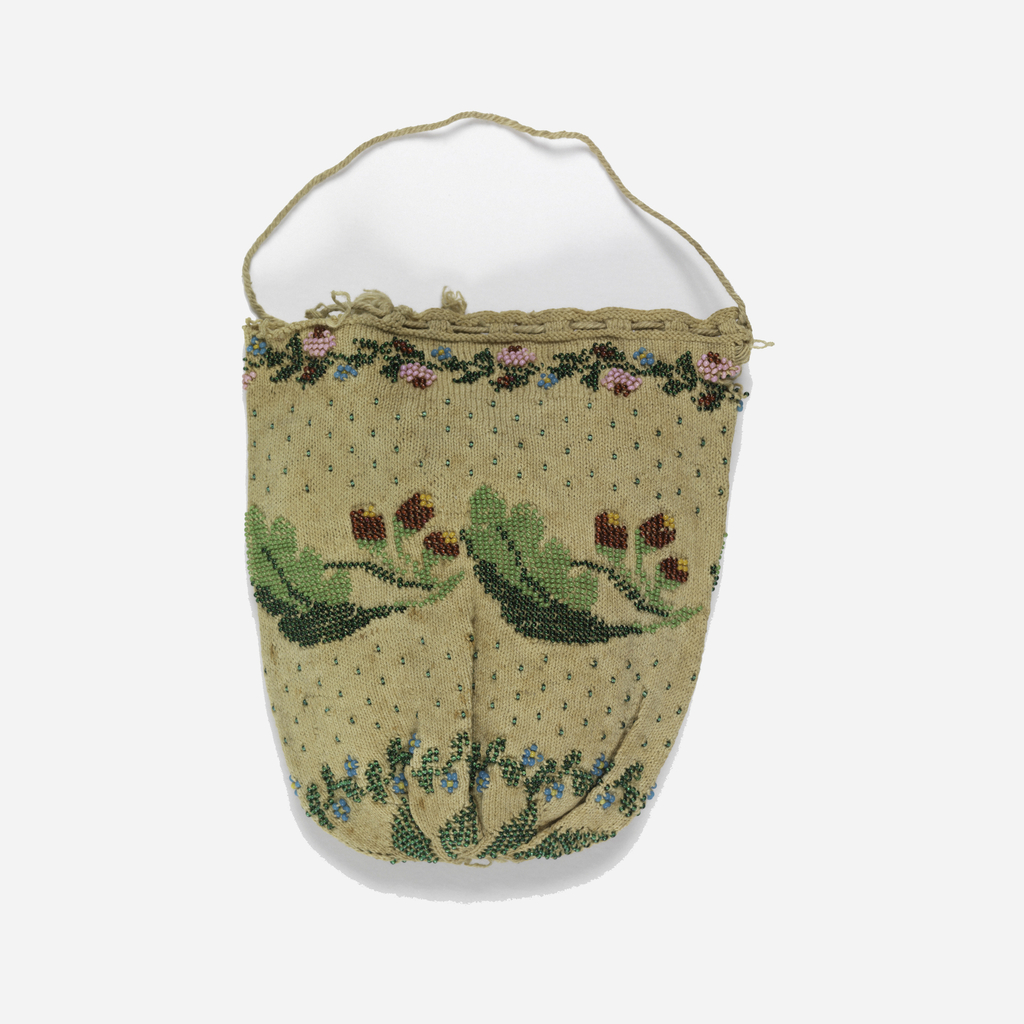 This is a Bag. It is dated mid-19th century and we acquired it in 1944. Its medium is linen, glass beads and its technique is beaded knitting. It is a part of the Textiles department.