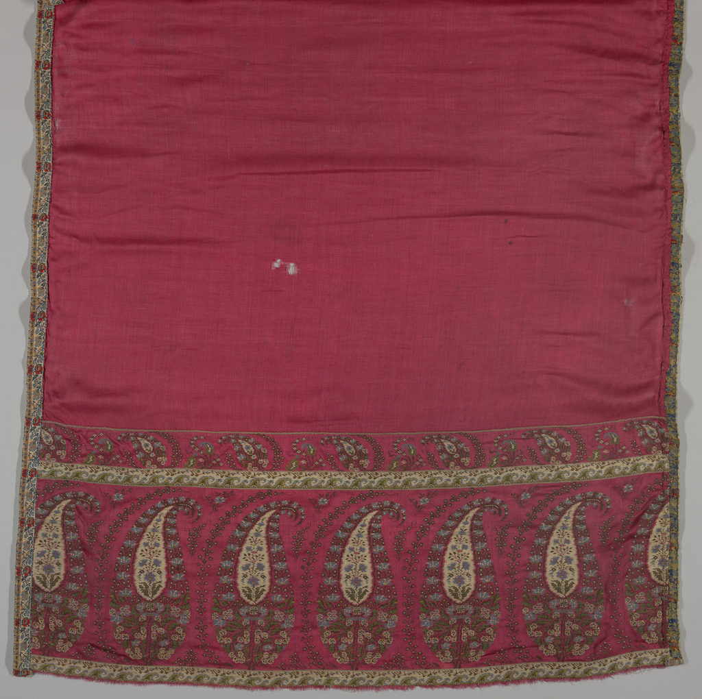 This is a Shawl. It is dated 19th century and we acquired it in 1944. Its medium is silk and wool and its technique is twill weave with supplementary weft patterning. It is a part of the Textiles department.