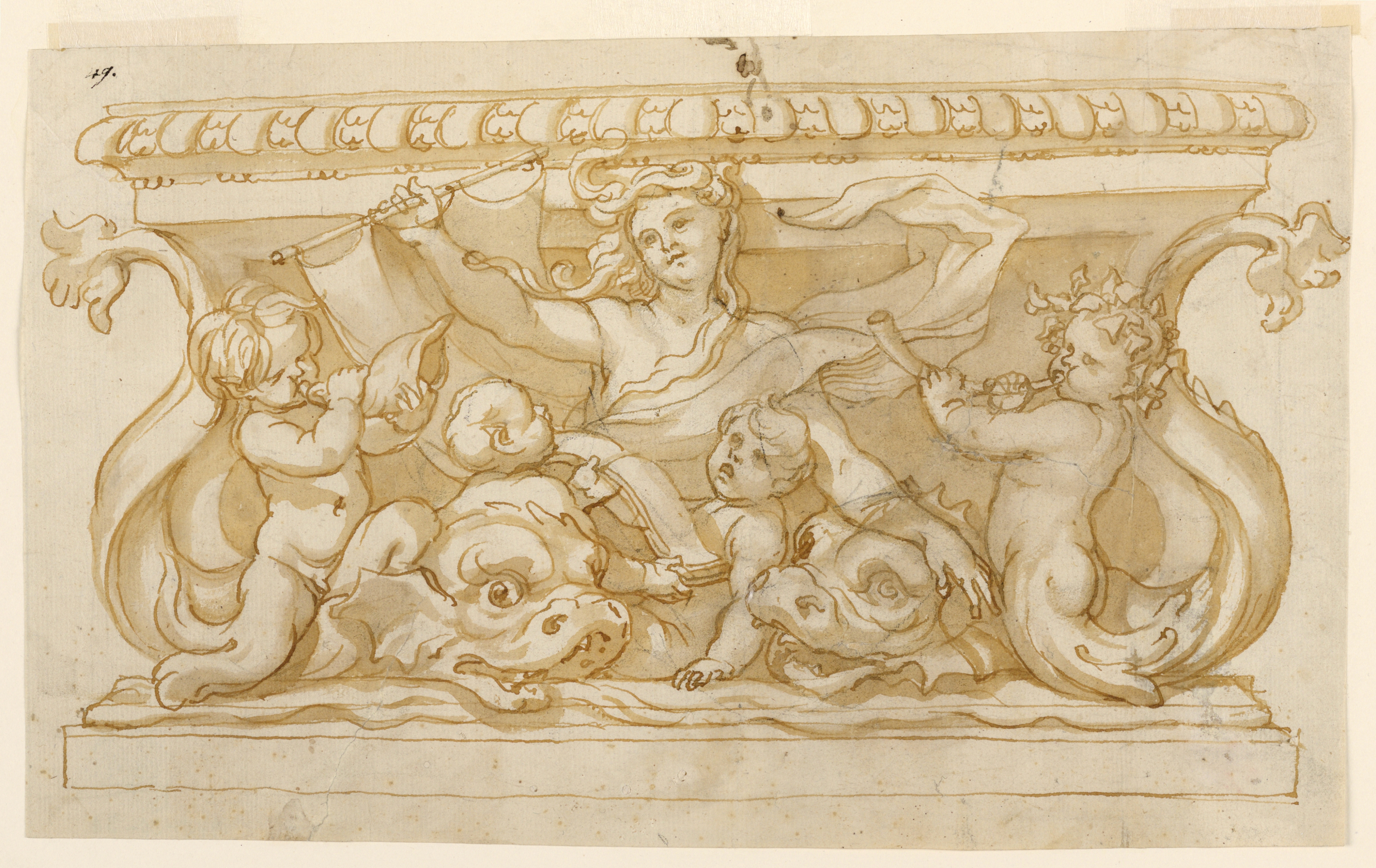 Drawing, Fountain Basin; Domenico Piola (Italian, 1627 - 1703); Italy; pen and brown ink, brush and brown wash, over black chalk on white laid paper; 20 x 32.6 cm (7 7/8 x 12 13/16 in.) Mat: 35.6 x 45.7 cm (14 x 18 in.); Museum purchase through gift of Mrs. John Innes Kane; 1945-26-30