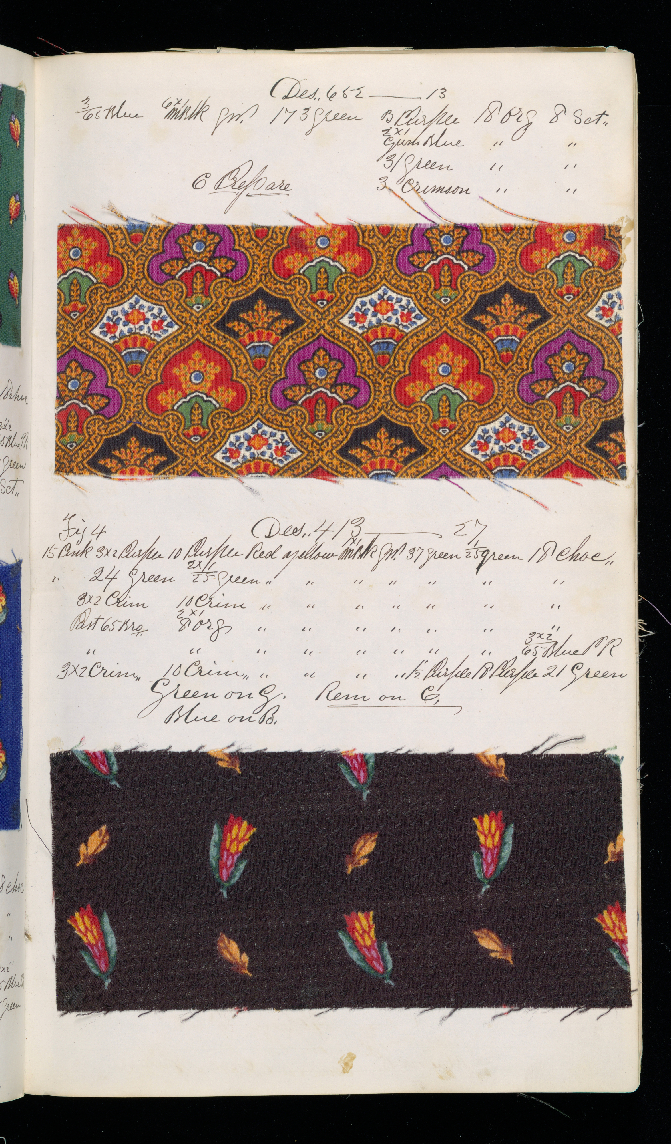 This is a Dyer's record book. It was manufactured by Old Pacific Print Works. It is dated 1870 and we acquired it in 1945. Its medium is cardboard, paper, and wool and its technique is printed plain weave and 2/2 twill. It is a part of the Textiles department.