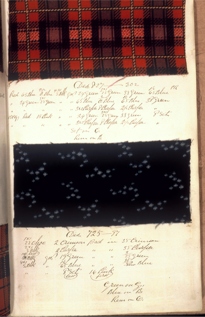 This is a Dyer's record book. It was manufactured by Old Pacific Print Works. It is dated 1870 and we acquired it in 1945. Its medium is cardboard, paper, and wool and its technique is printed plain weave and 2/2 twill. It is a part of the Textiles department.