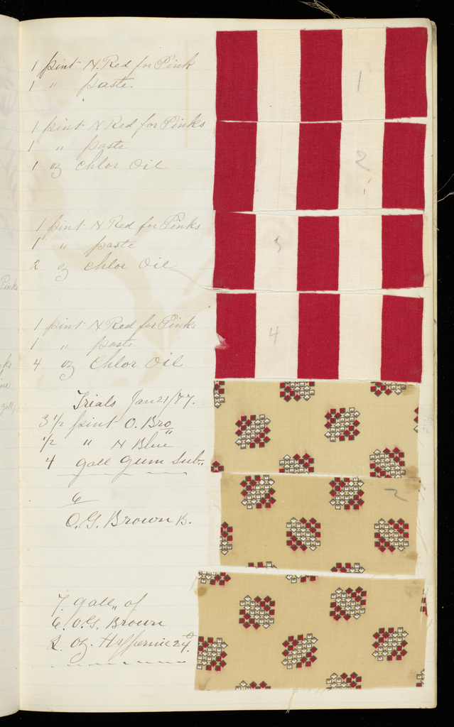 This is a Printer's sample book. It was manufactured by Cocheco Print Works. It is dated 1884–87 and we acquired it in 1945. Its medium is cardboard, paper, cotton. It is a part of the Textiles department.