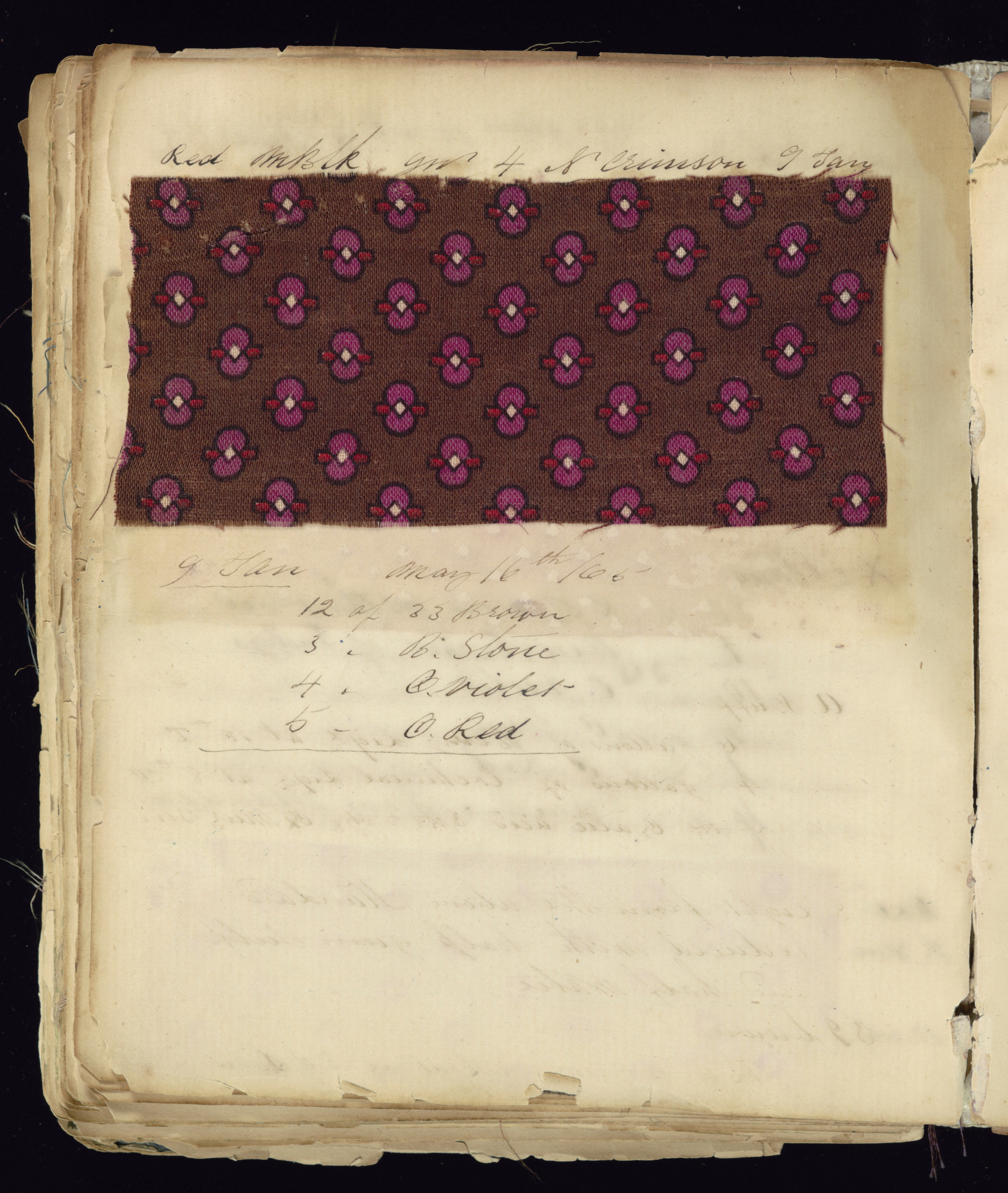 This is a Dyer's record book. It was company: Old Pacific Print Works. It is dated 1861–74 and we acquired it in 1945. Its medium is label: board covers, pen and ink on paper pages, cotton samples. It is a part of the Textiles department.