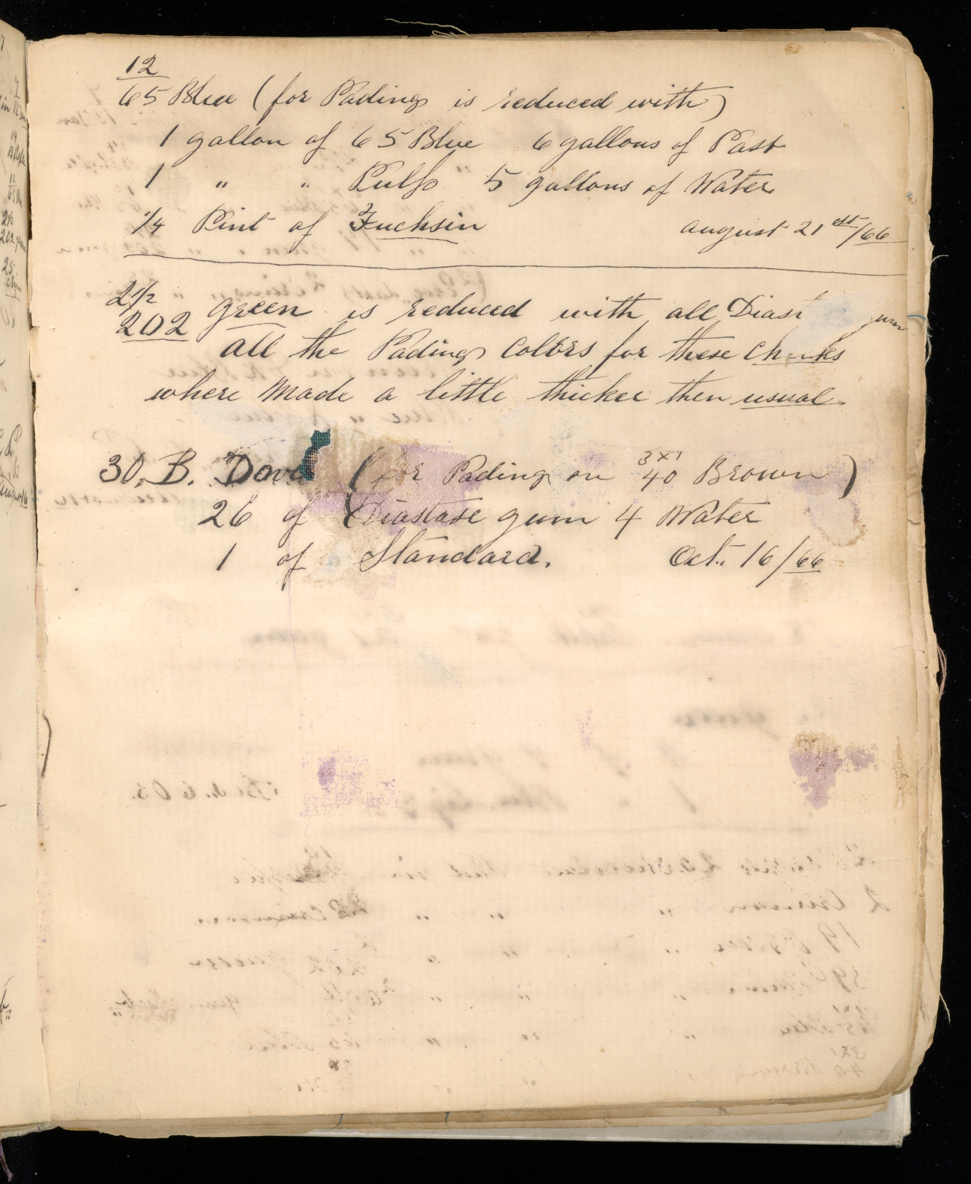 This is a Dyer's record book. It was company: Old Pacific Print Works. It is dated 1861–74 and we acquired it in 1945. Its medium is label: board covers, pen and ink on paper pages, cotton samples. It is a part of the Textiles department.