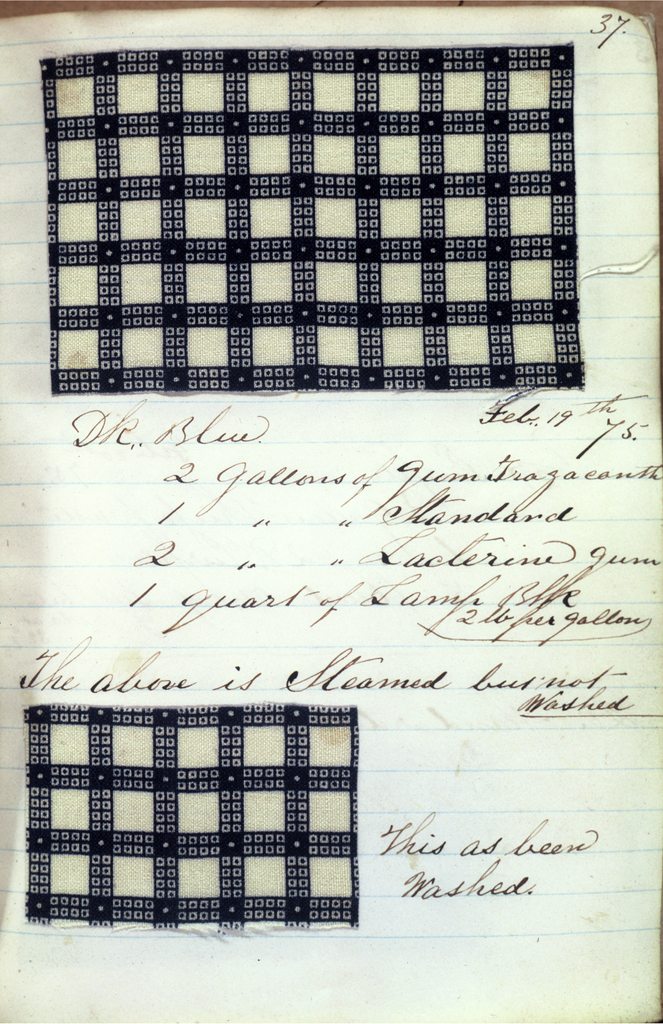 This is a Dyer's record book. It was manufactured by Old Pacific Print Works. It is dated 1874–76 and we acquired it in 1945. Its medium is cardboard, paper, printed samples. It is a part of the Textiles department.