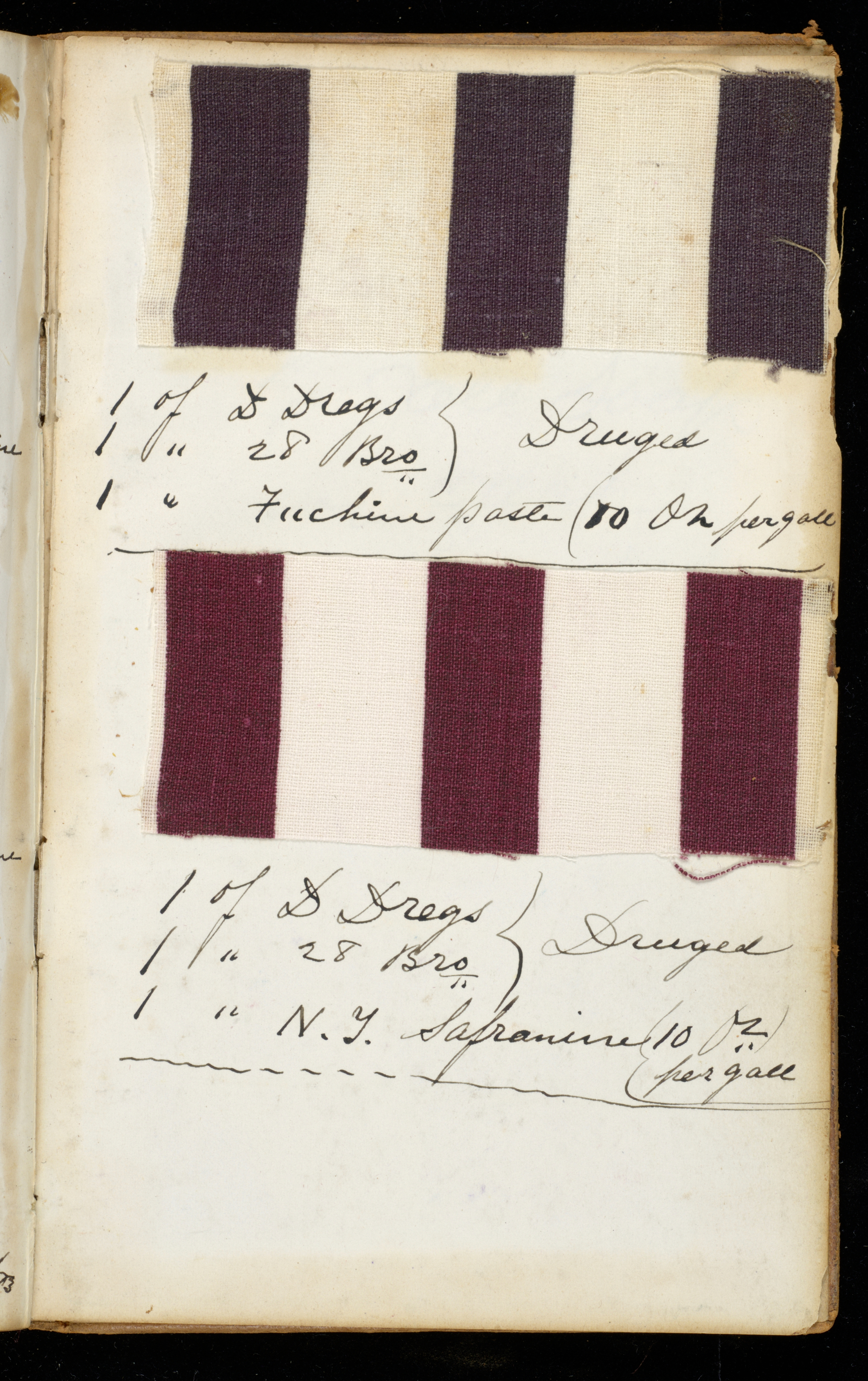 This is a Printer's sample book. It was manufactured by Old Pacific Print Works. It is dated 1882–83 and we acquired it in 1945. Its medium is leather, paper, cotton and wool and its technique is printed plain weave and 2/2 twill. It is a part of the Textiles department.
