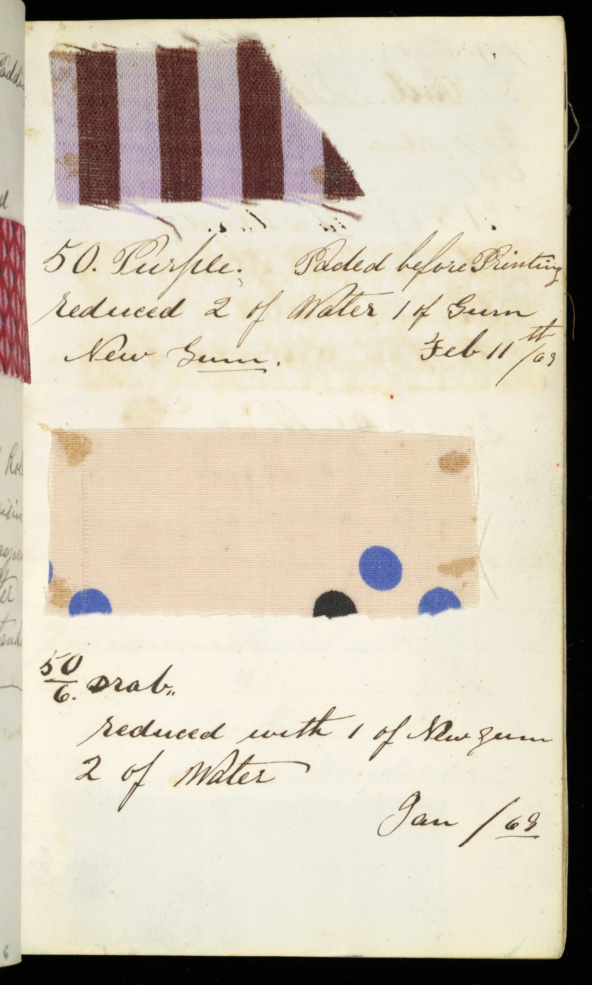 This is a Printer's sample book. It was manufactured by Old Pacific Print Works. It is dated 1866–75 and we acquired it in 1945. Its medium is paper and cotton. It is a part of the Textiles department.