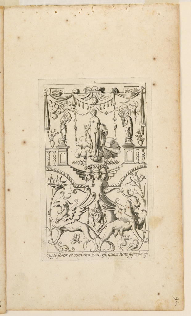 Print, Grotesque with Deities. Plate 04 “Juno,” 2nd state; René Boyvin (French, 1525 - 1625); After Léonard Thiry (Flemish, 1550); France; black ink on white paper; Sheet: 29.3 x 18.8 cm (11 9/16 x 7 3/8 in.) Platemark: 17.4 x 10.7 cm (6 7/8 x 4 3/16 in.); 1945-70-8