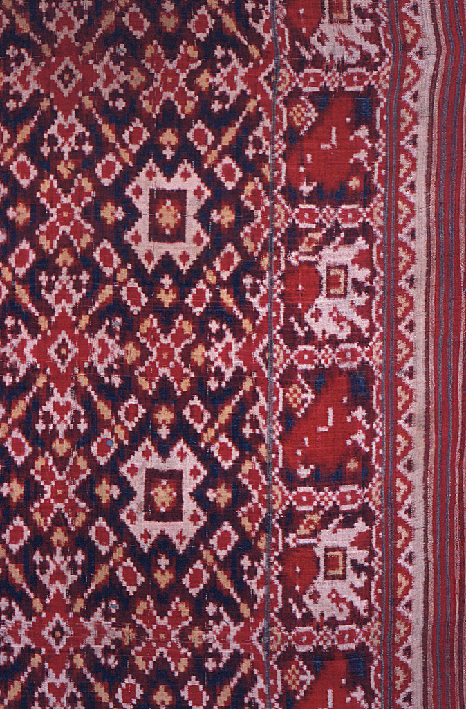 Acquired in 1946, this well-worn patola or double ikat textile, has a central field pattern known as Ratan Chowk Bhat or jewel mosaic. A border of elephants and parrots flank the side, while a double row of tulip flowers sprout at one end, with an arrowhead motif in single warp ikat at the palluv edge. Telltale signs of wear, cut edges, and hand stitched borders suggest the variety of incarnations this patola must have lived. It likely made its first public appearance at a Gujarati wedding. The mother of the groom may have worn it draped as a sari or it may have been given as a gift to the bridal couple. After much use, the owners stitched a red border to the treasured textile, perhaps to use it as a decorative furnishing in the home.