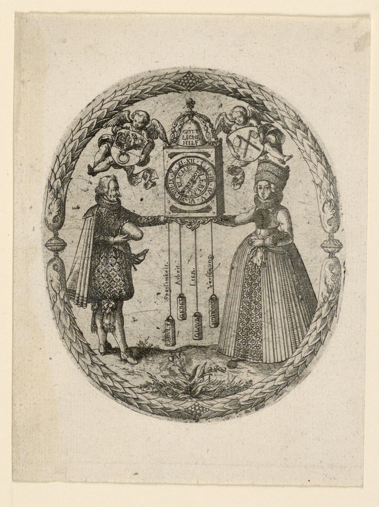Print, Allegorical representation of the wedding of a member of the von Ringles family in Strasburg with a von Hengel; Germany; black ink on white paper; H x W: 14.5 × 11 cm (5 11/16 × 4 5/16 in.); Museum purchase from the Mary Hearn Greims Fund; 1946-16-4