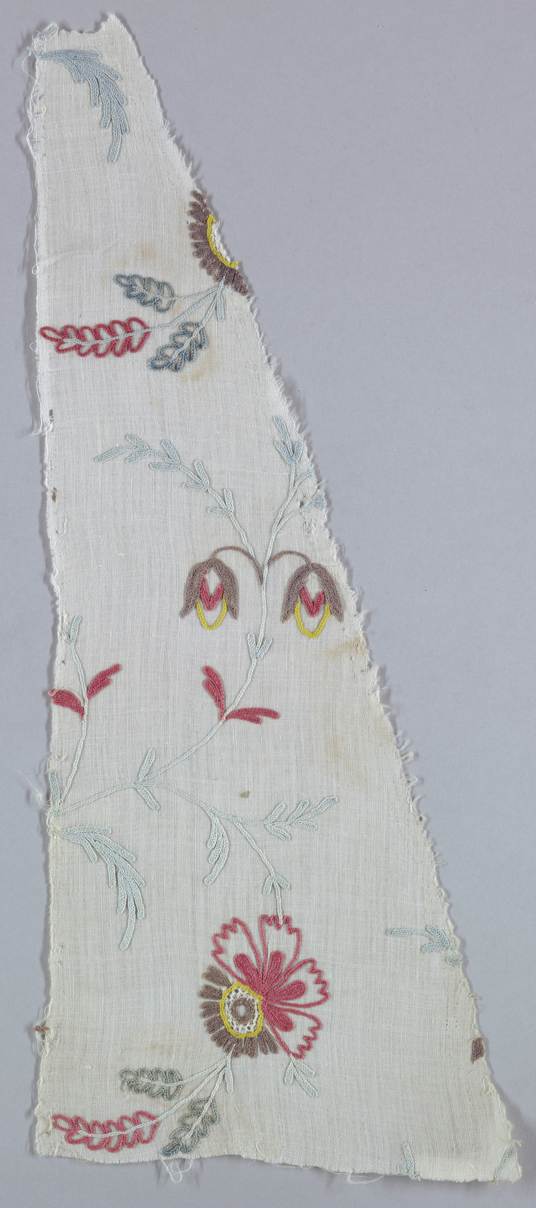 This is a Fragments. It is dated late 18th century and we acquired it in 1946. Its medium is cotton; metal threads and its technique is embroidered on plain weave. It is a part of the Textiles department.