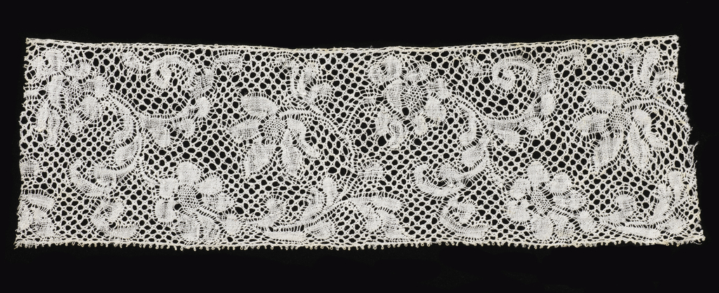 This is a Fragment. It is dated 18th century and we acquired it in 1946. Its medium is linen and its technique is bobbin lace, binche style with binche ground. It is a part of the Textiles department.