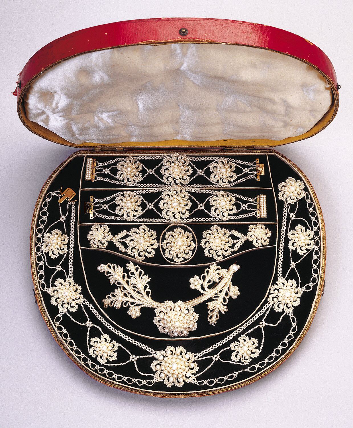 Seed Pearl Parure in original case (includes necklace, bracelets, earrings, brooch and bodice ornaments)