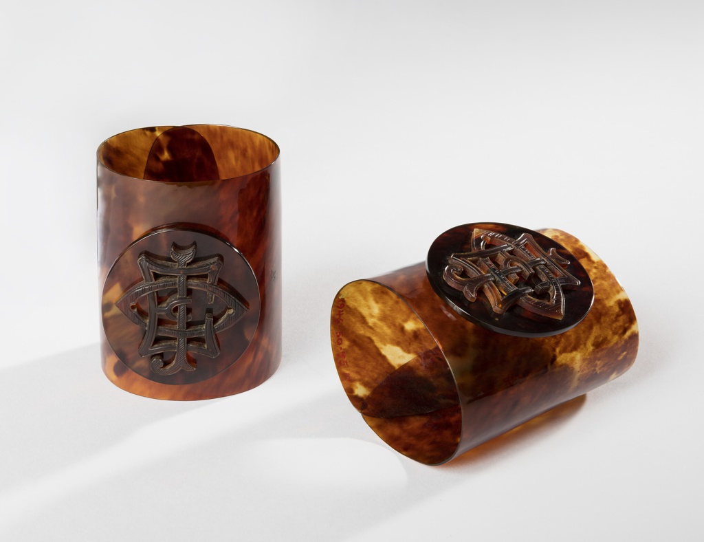This is a Pair of Bracelets. It is dated ca. 1870 and we acquired it in 1946. Its medium is shaped tortoiseshell with carved applied tortoiseshell monograms. It is a part of the Product Design and Decorative Arts department.