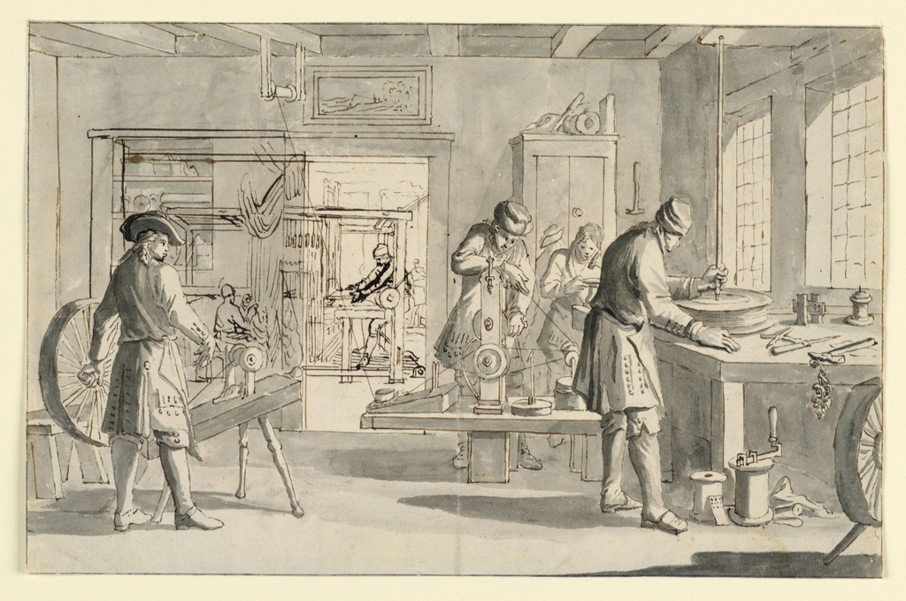 Drawing, The Interior of a Textile Factory; Unknown; France; pen and black ink, brush and gray wash on laid paper; 17.9 x 27.8 cm (7 1/16 x 10 15/16 in.); 1946-9-1