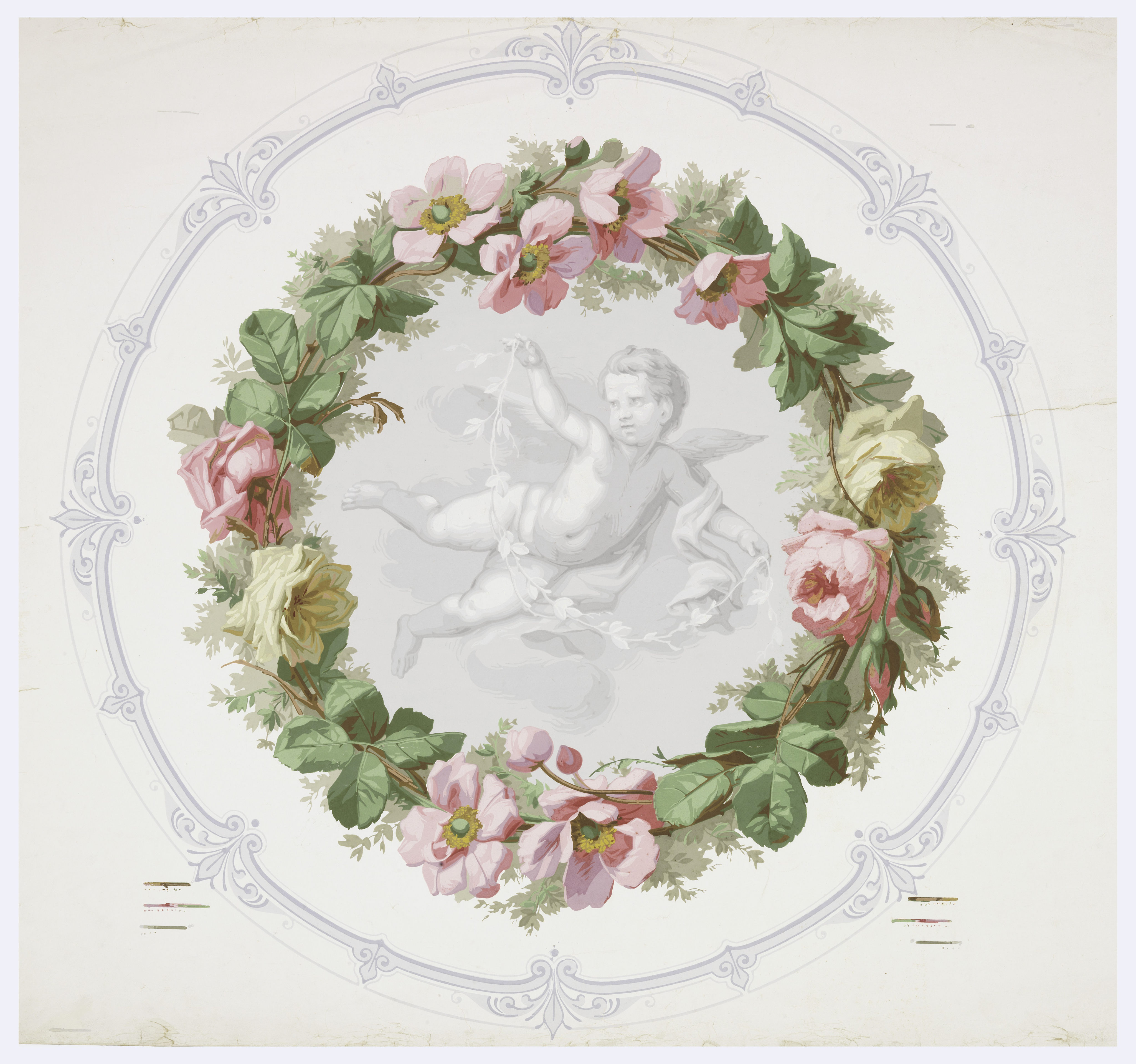 This is a ceiling medallion. It is dated 1850–60 and we acquired it in 1946. Its medium is block-printed on machine-made paper. It is a part of the Wallcoverings department.