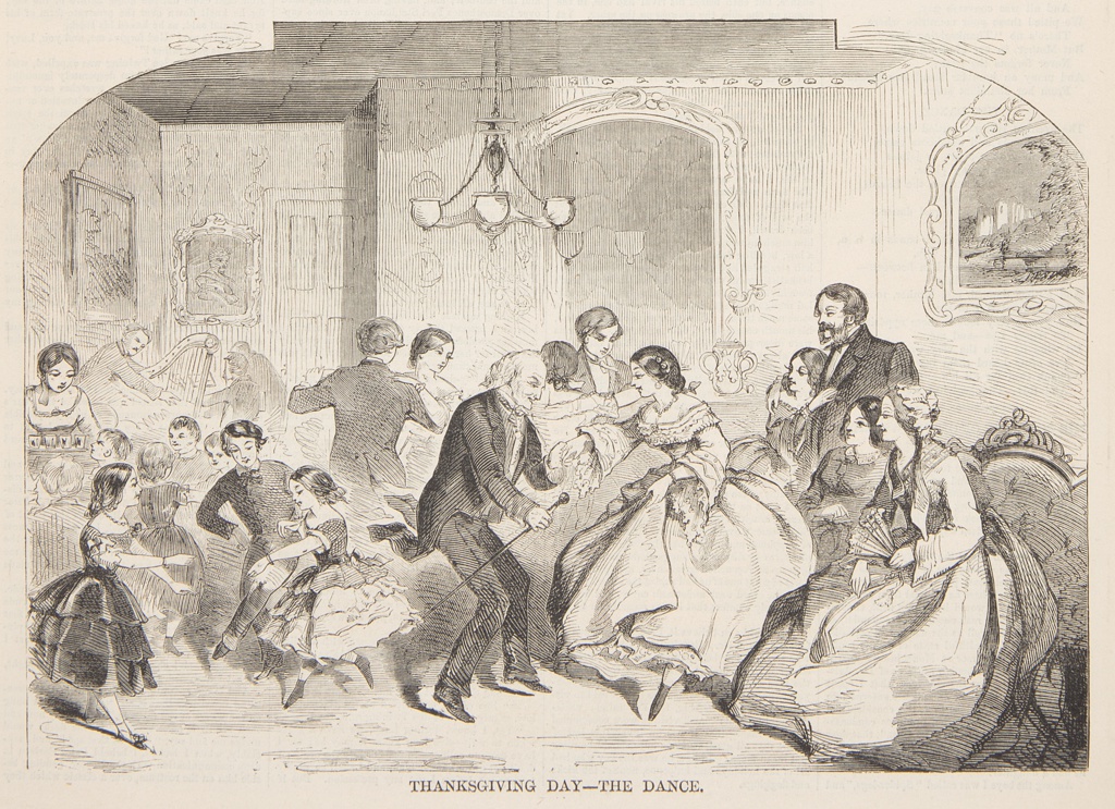 Print, Thanksgiving Day – The Dance; Winslow Homer (American, 1836–1910); Published by Harper's Weekly, Harper & Bros.; USA; wood engraving in black ink on paper; Image: 16.5 × 23.5 cm (6 1/2 × 9 1/4 in.); Gift of John Goldsmith Phillips, Jr.; 1947-4-40