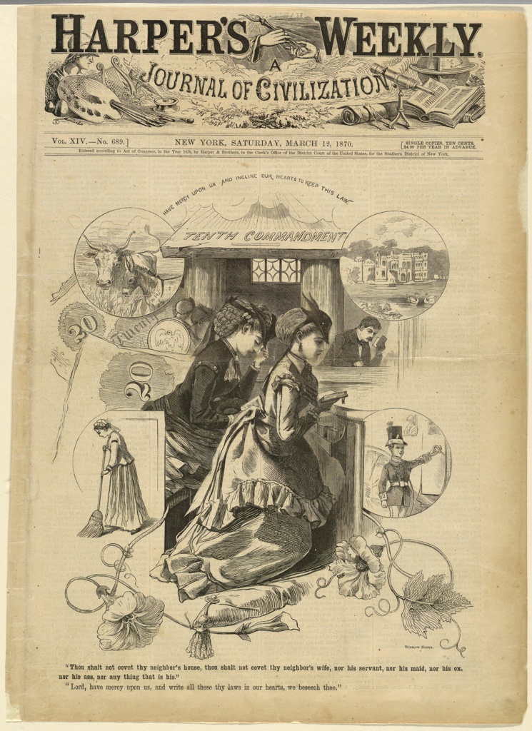 Print, Tenth Commandment; Winslow Homer (American, 1836–1910); Published by Harper's Weekly, Harper & Bros.; USA; wood engraving in black ink on paper; Image: 27.5 × 22 cm (10 13/16 × 8 11/16 in.); Gift of John Goldsmith Phillips, Jr.; 1947-4-48