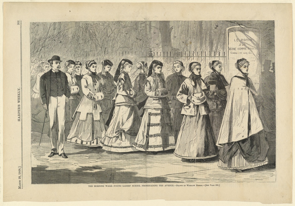 Print, The Morning Walk – Young Ladies' School Promenading the Avenue; Published by Harper's Weekly, Harper & Bros.; After Winslow Homer (American, 1836–1910); USA; wood engraving in black ink on paper; Image: 23 x 34.6 cm (9 1/16 x 13 5/8 in.); Gift of John Goldsmith Phillips, Jr.; 1947-4-61