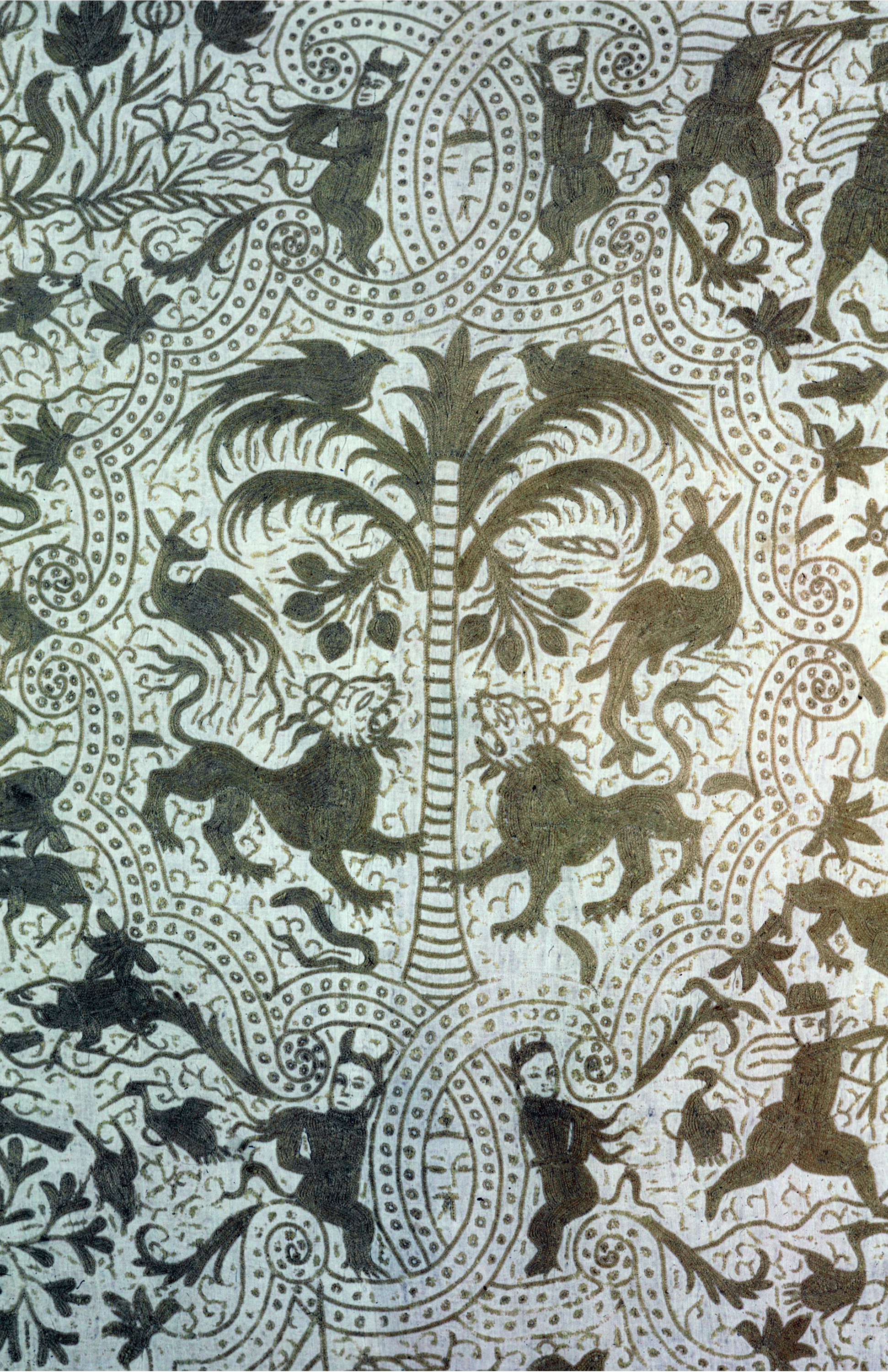 This is a Coverlet. It is dated 17th century and we acquired it in 1947. Its medium is tussah silk embroidery on cotton foundation and its technique is embroidered in chain stitches on plain weave foundation. It is a part of the Textiles department.