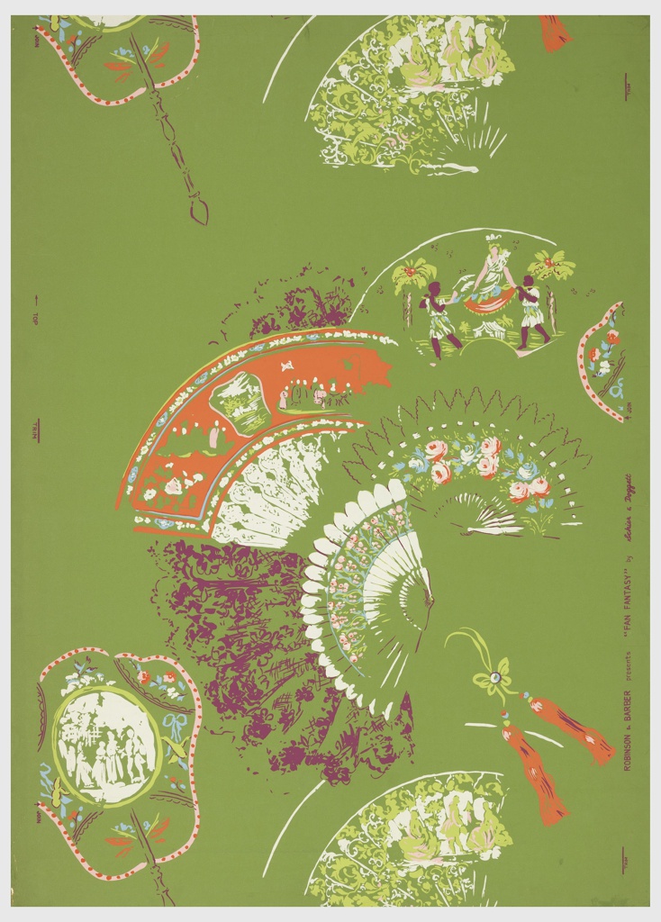 Printed in right selvedge: Robinson & Barber presents Fan Fantasy by Schier and Doggett.