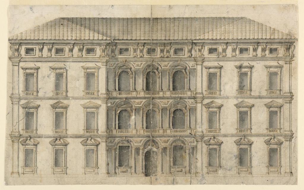 Drawing, Palace Façade Elevation; Italy; pen and brown ink, brush and grey wash on cream laid paper; 25.9 × 41.7 cm (10 3/16 × 16 7/16 in.); Gift of Mrs. Grafton H. Pyne; 1948-118-2