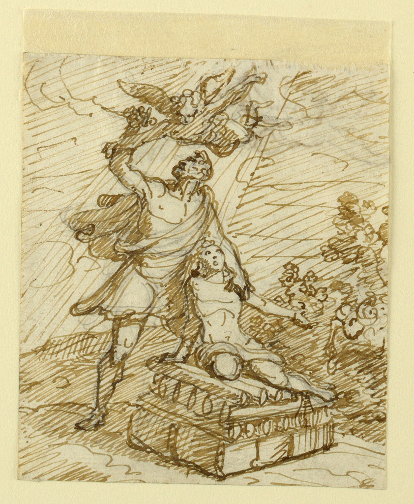 Drawing, The Sacrifice of Isaac; Probably Gaetano Monti (Italian, ca. 1750–1824); Italy; pen and brown ink, graphite on cream paper; 10.5 × 9.1 cm (4 1/8 × 3 9/16 in.); Gift of Mrs. Grafton H. Pyne; 1948-118-57
