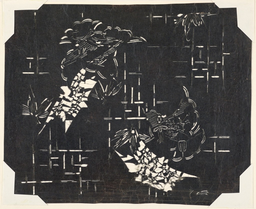 This is a Stencil. It is dated early 19th century - mid 20th century and we acquired it in 1948. Its medium is mulberry paper (kozo washi) treated with fermented persimmon tannin (kakishibu). It is a part of the Drawings, Prints, and Graphic Design department.