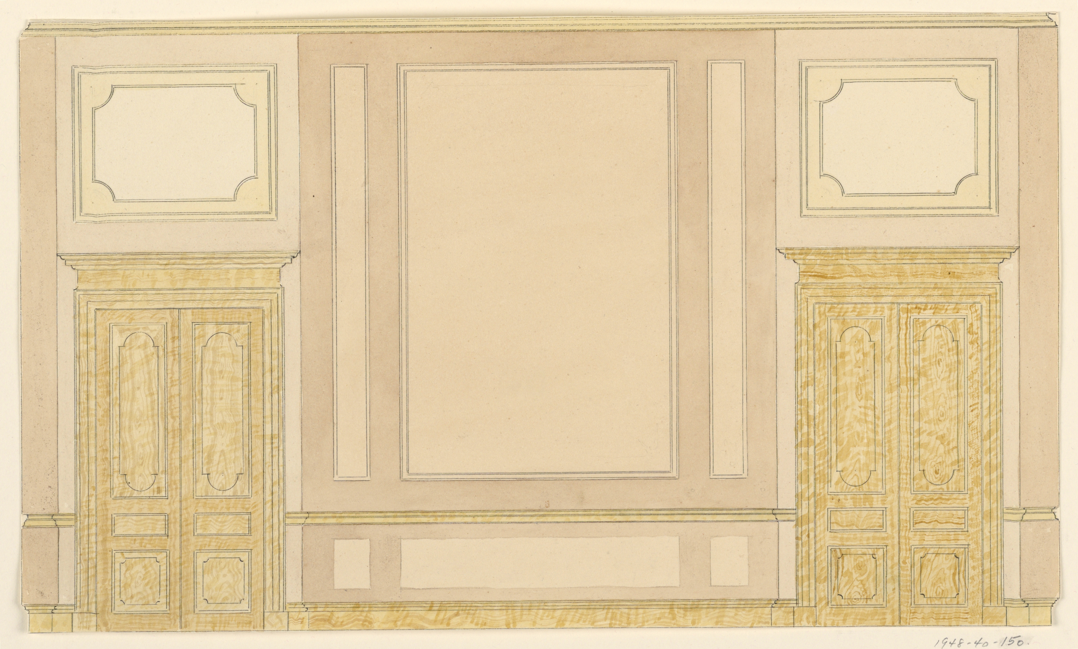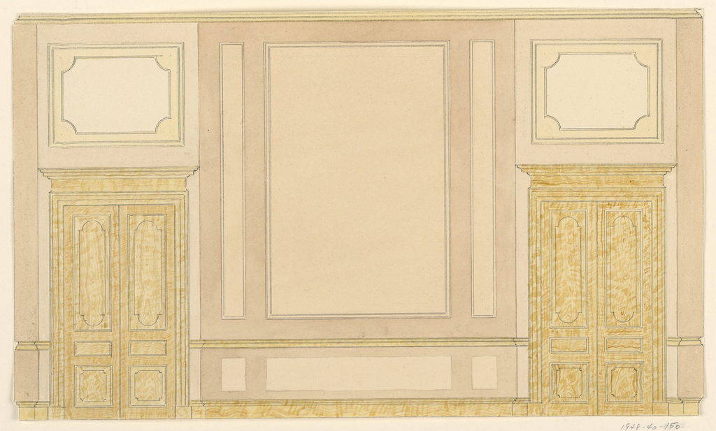 Drawing, Side wall elevation; Designed by Frederick Crace (English, 1779–1859); England; graphite, pen and black ink, brush and tan-colored wash on wove paper; H x W: 18 x 30.5 cm (7 1/16 in. x 12 in.); Museum purchase through gift of Mrs. John Innes Kane; 1948-40-150