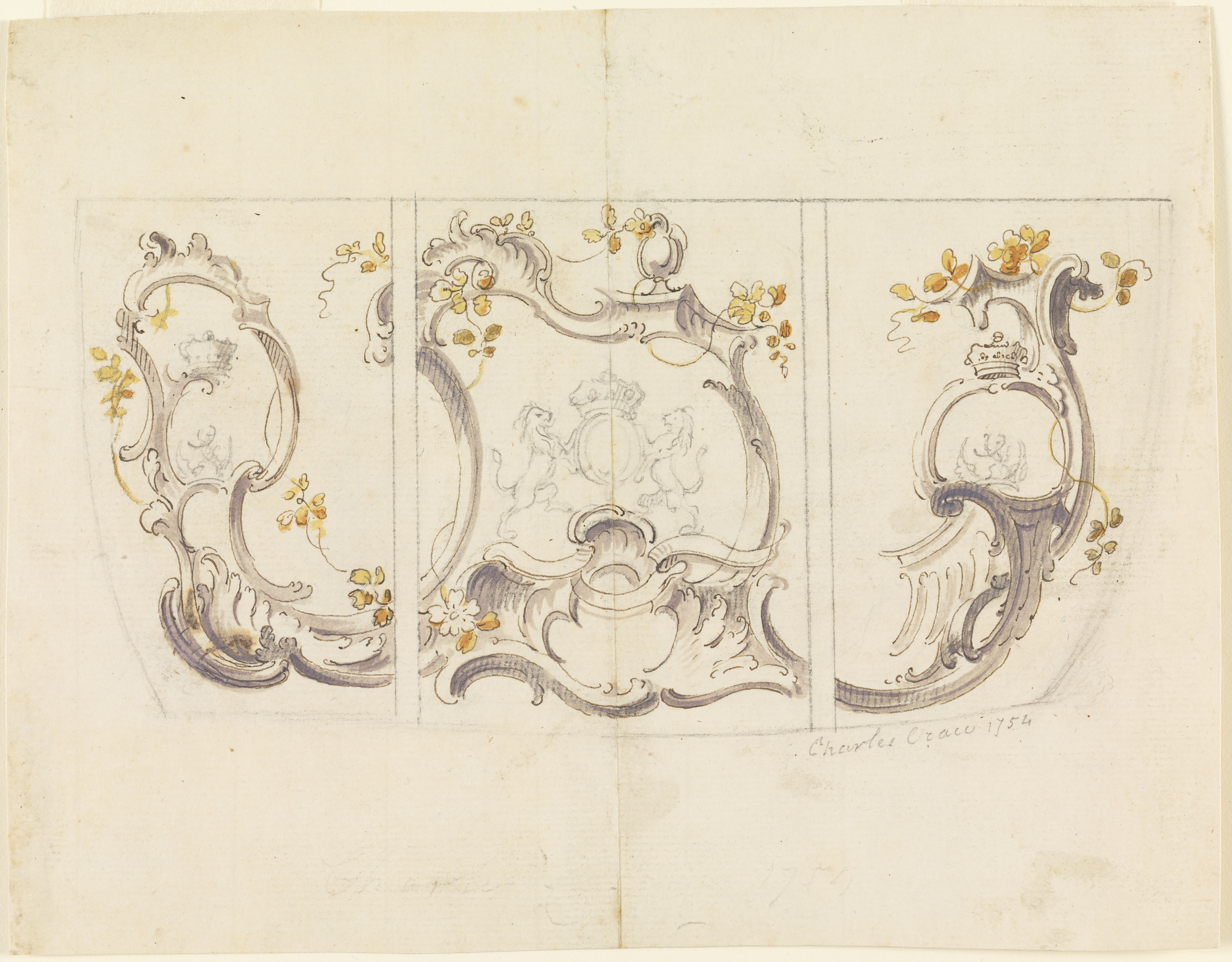 This is a Drawing. It was created by Charles Crace. It is dated 1754 and we acquired it in 1948. Its medium is pen and brown ink, brush and gray wash, yellow watercolor, charcoal on white laid paper. It is a part of the Drawings, Prints, and Graphic Design department.
