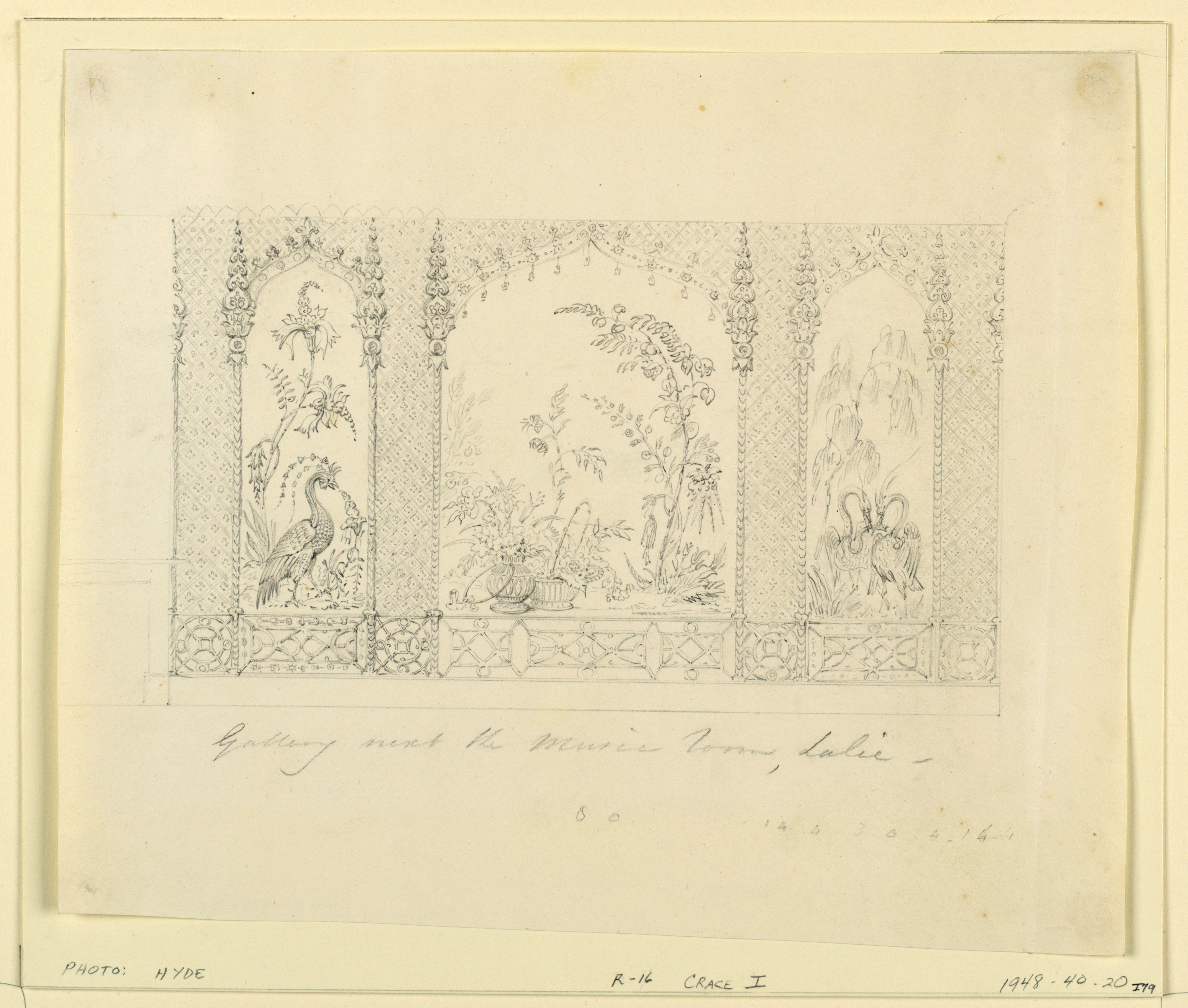 Drawing, Design for North wall, Yellow Drawing Room, Royal Pavilion, Brighton; Possibly by Robert Jones (British, active, early 19th century); England; graphite on paper; Mat: 35.6 x 45.7 cm (14 x 18 in.) 24.8 x 29.3 cm (9 3/4 x 11 9/16 in.); Museum purchase through gift of Mrs. John Innes Kane; 1948-40-20