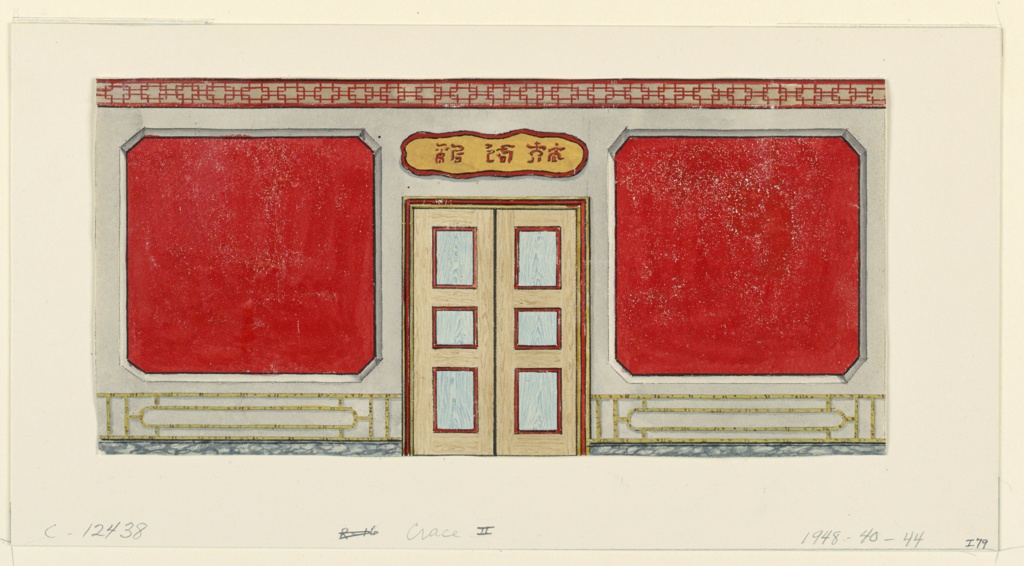 Drawing, Design for Wall with Doorway, probably for the Ante Room, Royal Pavilion, Brighton; Designed by Frederick Crace (English, 1779–1859); England; brush and watercolor, pen and black ink, graphite on white wove paper; 11.3 x 23.5 cm (4 7/16 x 9 1/4 in.); Museum purchase through gift of Mrs. John Innes Kane; 1948-40-44