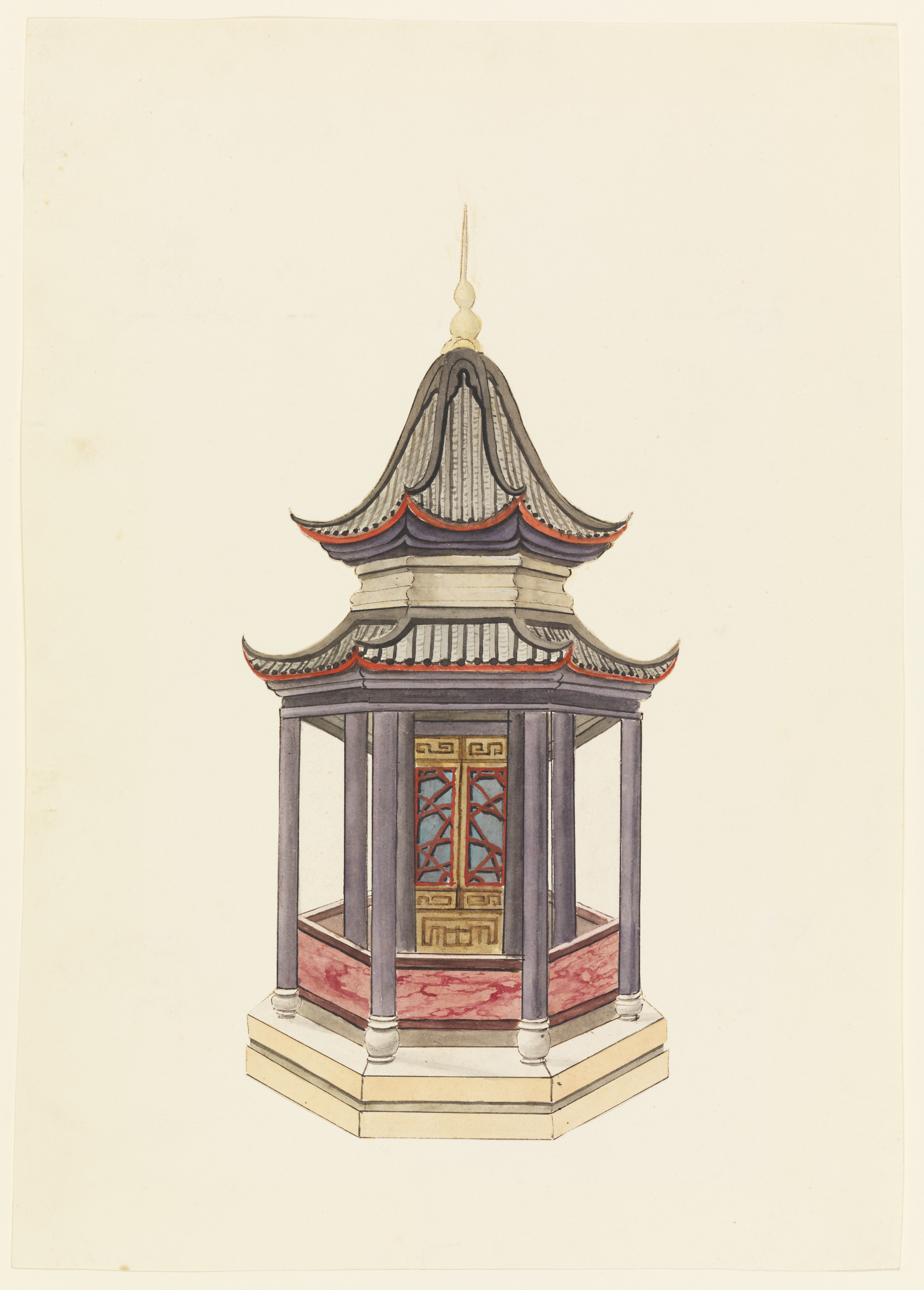 Drawing, Design for a Chinese Pavilion; Designed by Frederick Crace (English, 1779–1859); England; brush and watercolor, pen and ink on paper; H x W: 26.5 x 10.4 cm (10 7/16 x 4 1/8 in.); Museum purchase through gift of Mrs. John Innes Kane; 1948-40-83