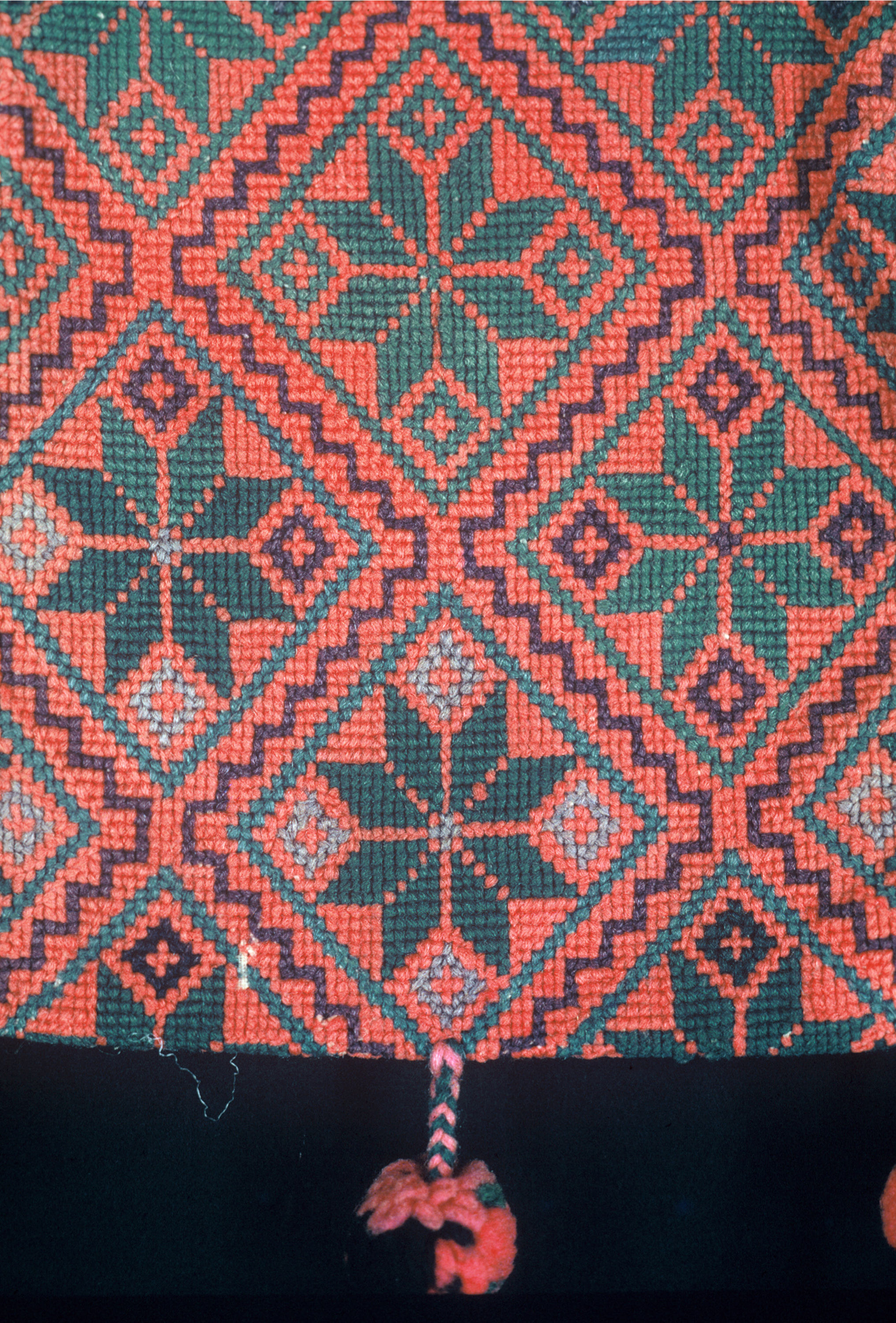 This is a Bag . It is dated 19th century and we acquired it in 1949. Its medium is wool, cotton and its technique is cross-stitch embroidery on compound weave. It is a part of the Textiles department.