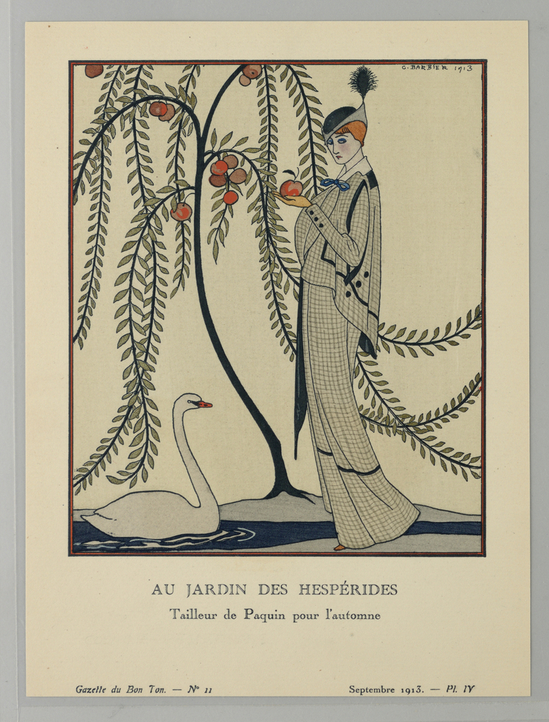 Printed in black ink, lower center: AU JARDIN DES HESPÉRIDES / Tailleur de Paquin pour l’automne (IN THE GARDEN OF THE HESPERIDES / autumn tailored suit by Paquin); lower left: Gazette du Bon Ton (Journal of Good Taste). — No 11; lower right: Septembre (September) 1913. — Pl. IV