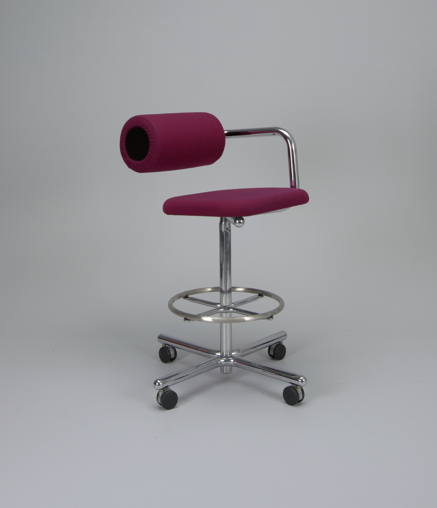 "Rollback" operational stool Chair; Manufactured by Herman Miller Furniture Company (United States); USA; chrome-plated steel, polyurethane foam, nylon, aluminum, fabric; Other: 71 x 40.6 cm (27 15/16 x 16 in.) H x W x D (Dust Mitigation 2012): 39 x 57.5 x 57.5 cm (15 3/8 x 22 5/8 x 22 5/8 in.); 1981-24-1
