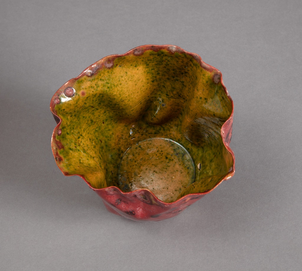 This is a Bowl. It was company: Biloxi Art Pottery and ceramist: George E. Ohr. It is dated 1893–1909 and we acquired it in 1984. Its medium is painted and glazed earthenware. It is a part of the Product Design and Decorative Arts department.
