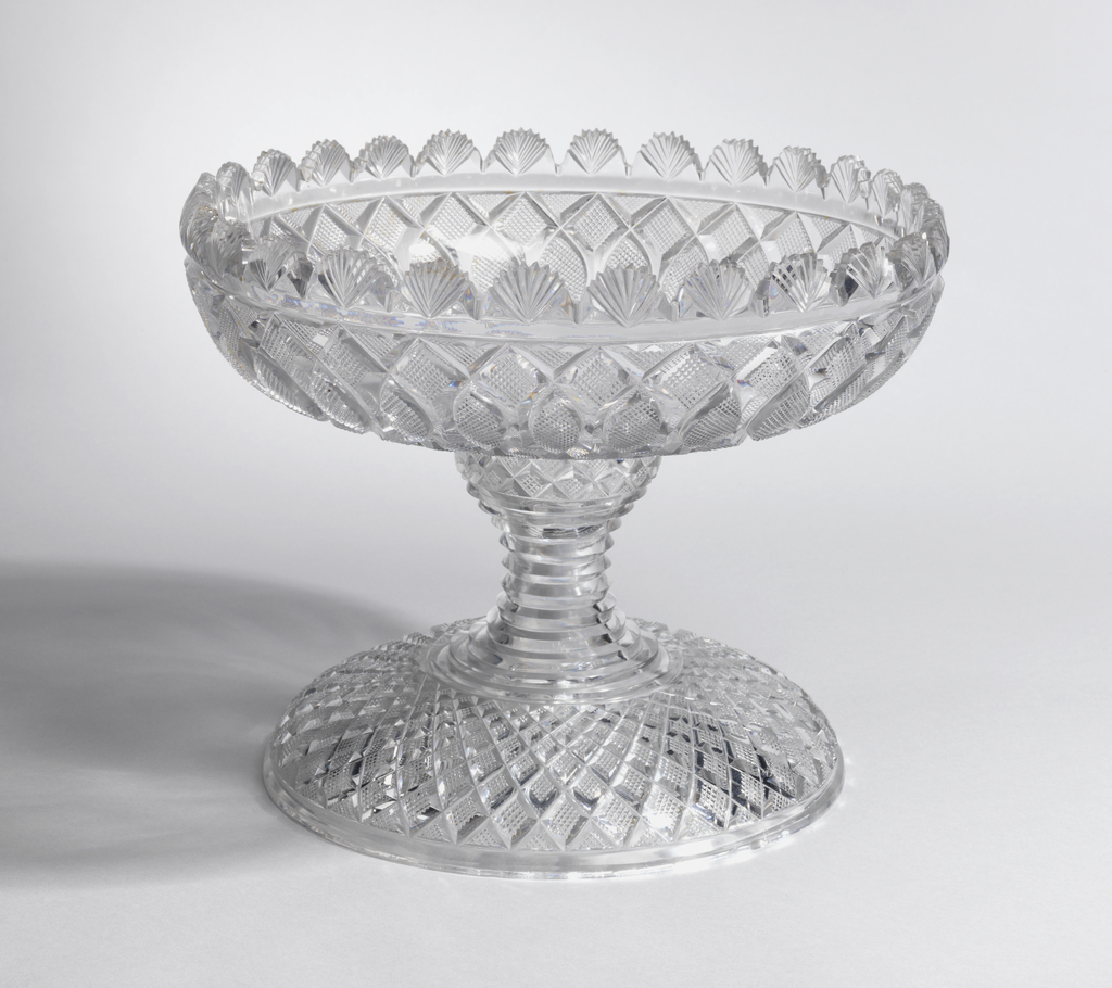 This is a bowl and stand. It is dated ca. 1825–30 and we acquired it in 1986. Its medium is glass. It is a part of the Product Design and Decorative Arts department.