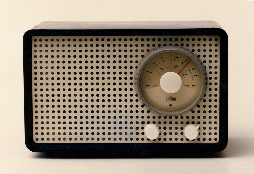 This is a radio. It was co-designed by Artur Braun and Fritz Eichler and manufactured by Braun AG. It is dated 1961 and we acquired it in 1986. Its medium is phenolic plastic, steel, electronic components. It is a part of the Product Design and Decorative Arts department.