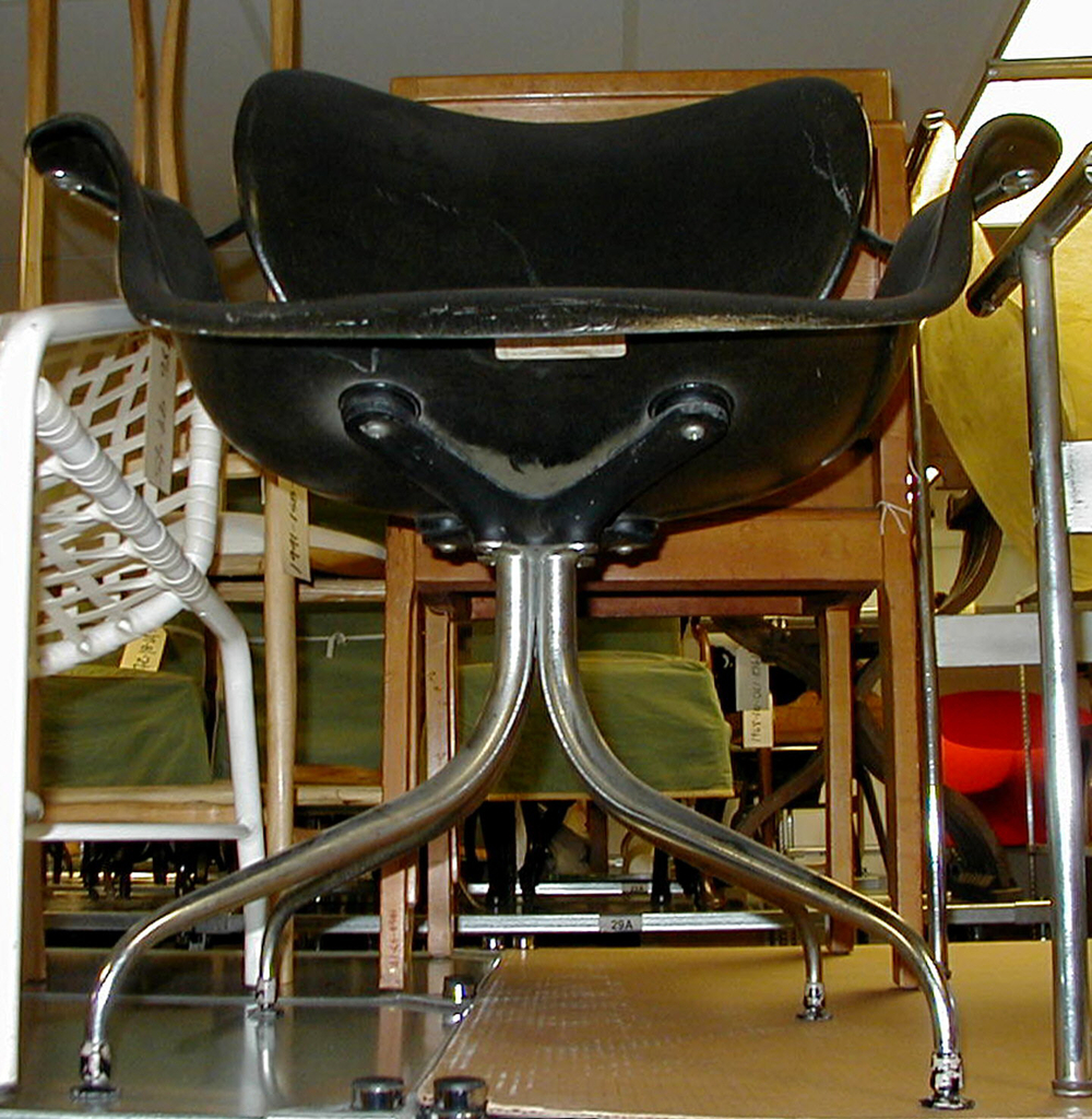 This is a chair. It was designed by George Nelson and manufactured by Herman Miller Furniture Company. It is dated 1958 and we acquired it in 1986. Its medium is molded fiberglass, swaged tubular steel, rubber composite. It is a part of the Product Design and Decorative Arts department.