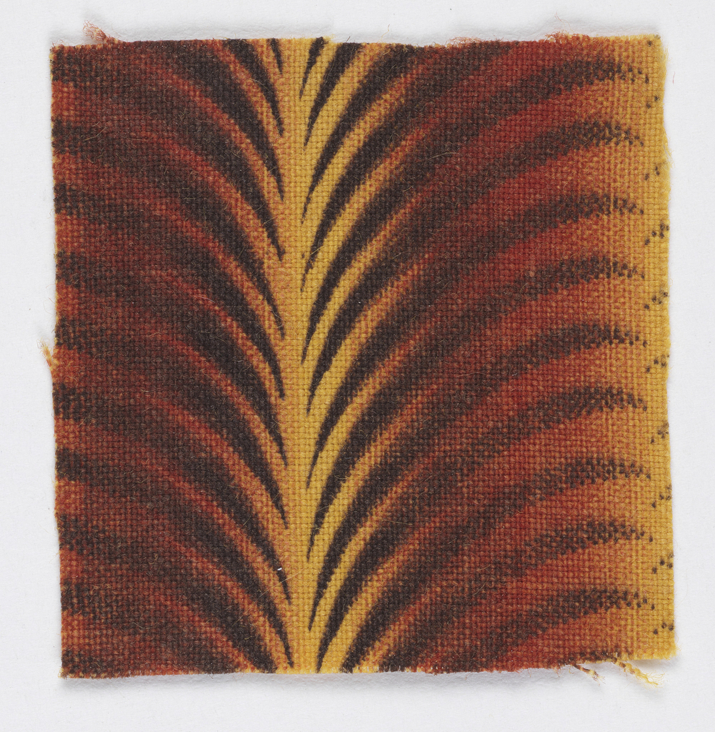 This is a Sample. We acquired it in 1987. Its technique is printed by black and brown roller on yellow plain weave. It is a part of the Textiles department.