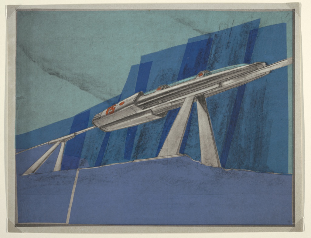 Donald Deskey’s designs for a monorail at MacArthur Airport proposed a freight and passenger network that better integrated the utility airport with existing Long Island traffic and facilities. Transporting passengers by day, the monorail concept would move freight at night, which would be efficiently delivered to terminals and dispersed from there.